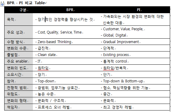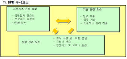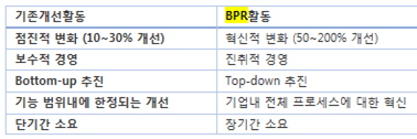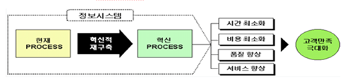 (개념) 근본적으로 다시 생각하고 비즈니스 프로세스를 획기적으로 재설계함으로써 비용,품질,시간을 개선하는 경영혁신 활동
