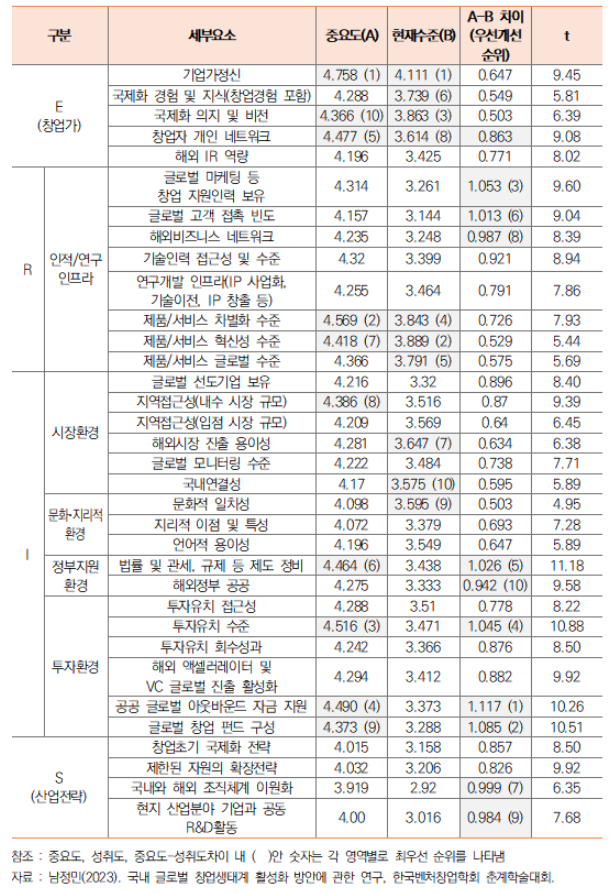 ㅇ 반면, I(정부지원환경)과 I(투자환경)은 중요하나 현재 수준이 낮은 것으로 인식되어, 우선적으로 법률 및 관세, 규제 등 제도 정비, 해외정부 공공, 글로벌 창업펀드 구성, 해외 액셀러레이터 및 VC 글로벌 진출, 공공 글로벌 아웃바운드 자금 지원 등의 정책적 제도 구축 필요