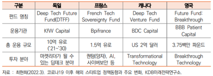 ㅇ ’19년 프랑스에서는 딥테크 육성을 위한 ‘Deep Tech Plan’을 도입하였으며, ’21년 영국, 프랑스, 독일, 캐나다는 정책금융기관 등을 활용하여 딥테크 전문펀드 결성