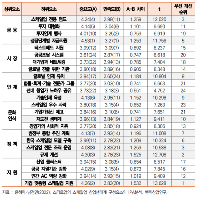 [ 스케일업 창업생태계 구성요소의 IPA분석 결과 ]