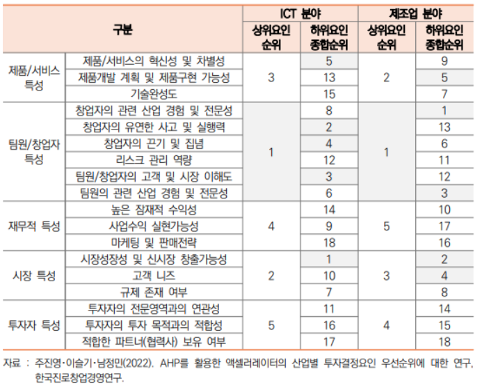 - 하위요인에서는 ICT 분야와 제조업 분야 모두 ‘시장성장성 및 신시장 창출가능성’을 높이 평가하는 것으로 나타났으며, ‘팀원의 관련 산업 경험 및 전문성’, ‘창업자의 끈기 및 집념’에 대해서 두 분야 모두 중요한 요인으로 평가됨