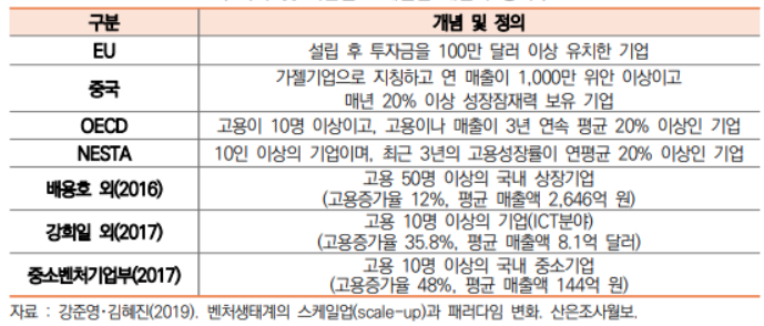 ㅇ 스케일업은 고용이 10명 이상이고, 고용이나 매출이 3년 연속 평균 20% 이상인 기업을 의미하며, 국가 및 기관별로 조건과 명칭이 다르지만 공통적으로 고성장에 초점을 둠