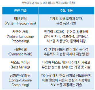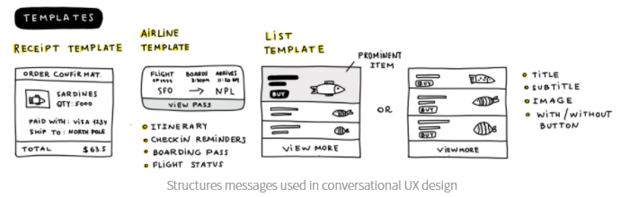 - 텍스트, 음성 및 시각 : 예를 들면 아이메시지의 다채로운 경험이 있다. 클라이언트는 입력하거나 말을 할 수도 있고 채팅 맥락에 따라 시각적 UI 위젯과 상호작용도 가능하다. 개발자 관점에서 과제는 챗봇이 적절한 맥락에서 적절한 UI 상호작용을 제공하도록 하는 것이다.