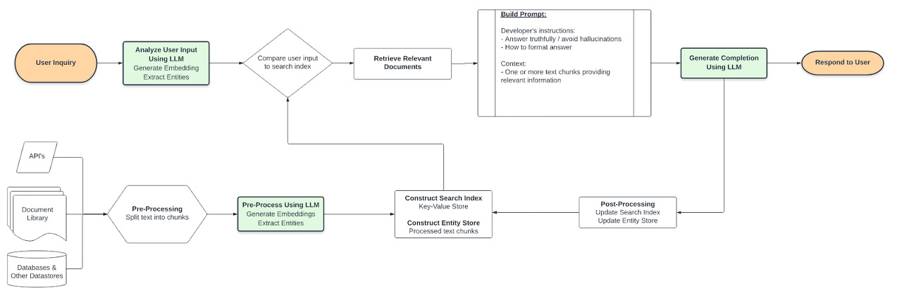 주어진 사용자 질의는 프롬프트 구성이라는 과정을 거치는데, 컴파일된 프롬프트는 일반적으로 개발자가 하드 코딩한 프롬프트 템플릿, 몇 가지 예시로 제공하는 유효한 출력의 예시, 외부 API에서 검색된 필요한 정보, 벡터 데이터베이스에서 검색된 관련 문서 집합을 결합하는 방식으로 최적의 프롬프트를 만들어 낸다. 이 과정을 다시 도식화하면 다음 그림과 같이 된다.