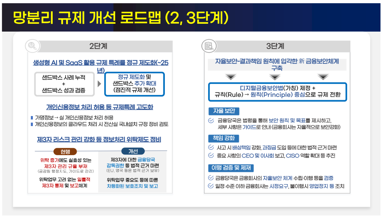 망분리는 외부와 연결된 컴퓨터망과 내부만 연결된 컴퓨터망을 완전히 분리해야 하는 규제로 금융사와 전자금융업자가 대상이다. 관련해 금융당국은 점진적으로 자율성을 가지는 방향으로 규제 완화를 추진하겠다고 답했다.