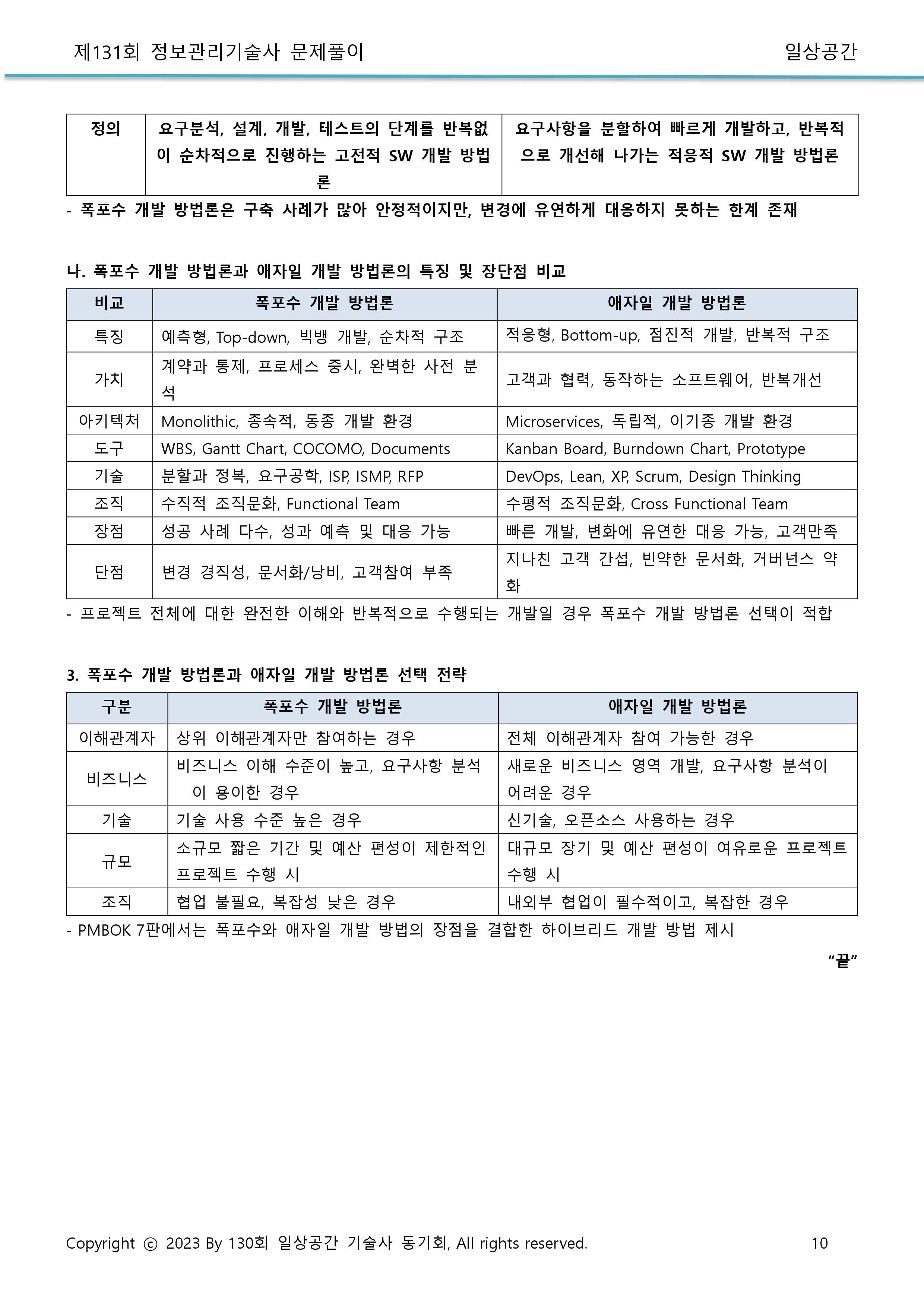 6. RAD 기법 : 2~3개월의 짧은 개발 주기 동안 S/W를 개발하기 위한 순차적인 프로세스 모델 (범위/요구사항 명확시 신속한 완전기능 구현가능, 기술적 위험 높은 경우 부적합)