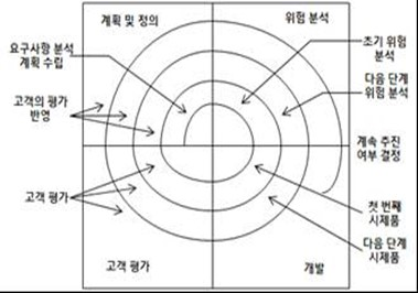3. 나선형 모델 : 계획/정의(목표, 제약조건 설정) > 위험분석(우선순위 기능선택) > 개발/구축(선택기능개발) > 고객평가