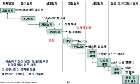 1. 폭포수 모델 : 고전적 사이클, 분석, 설계, 개발/구현, 시험, 유지보수를 검토 및 승인을 거쳐 순차적 하향적으로 접근/개발하는 생명주기 모델