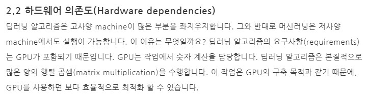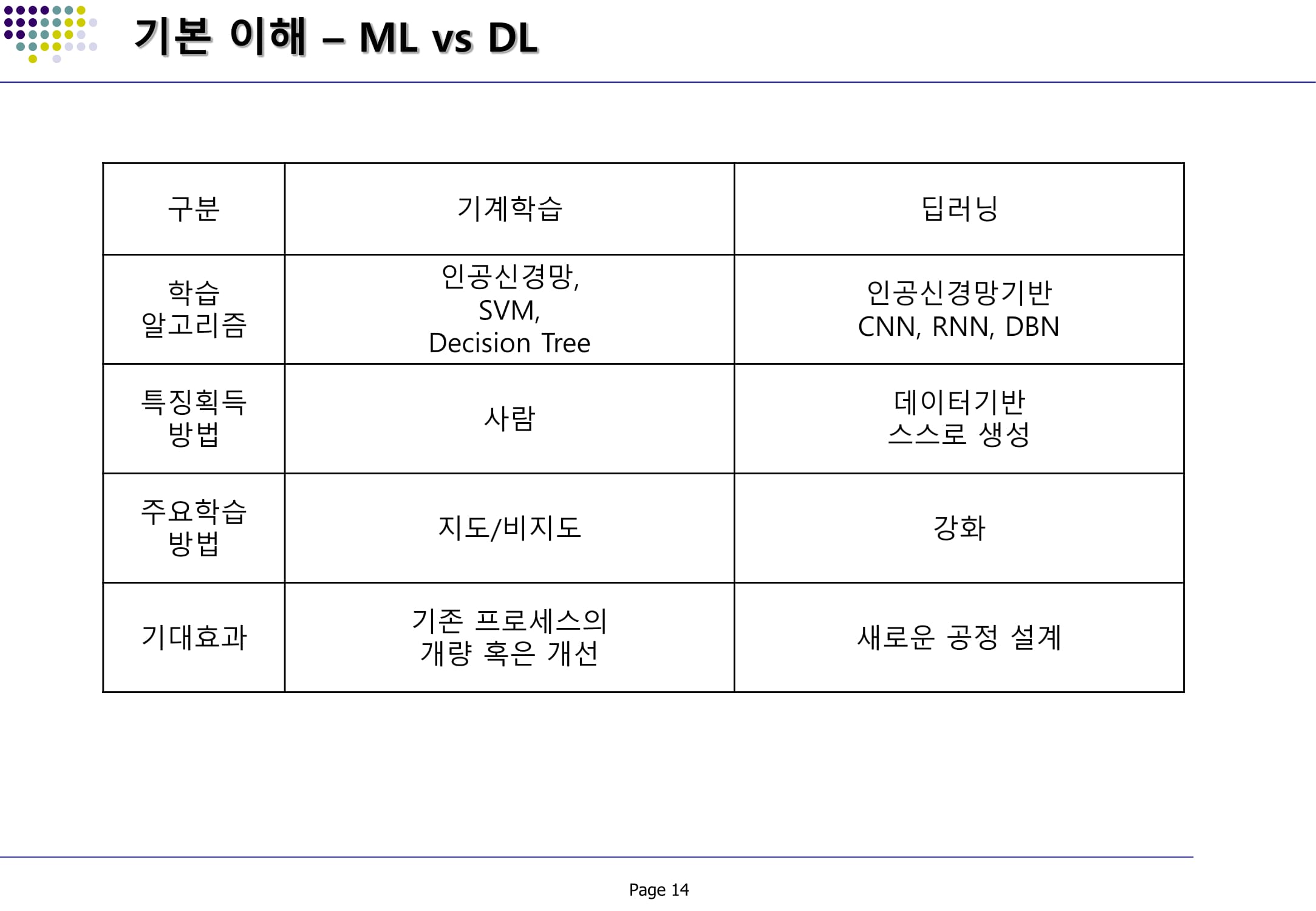 머신 러닝(Machine Learning)과 딥 러닝(Deep Learning)은 입력(Input), 특징 추출(Feature Extraction)과 분류(Classification), 결과도출(Output)이라는 과정은 동일하지만, 머신 러닝(Machine Learning)은 기본적으로 사람이 입력한 알고리즘을 통해 데이터를 분석하고, 이를 통해 학습(Training)한 후, 그 기반으로 추론(Inferencing)을 진행한다.