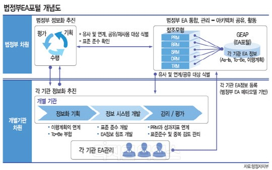정부가 각 공공기관별로 운영 중인 EA(정보기술아키텍처) 시스템을 '범정부EA포털'에 통합한다. EA는 기관의 업무에 따라 하드웨어·소프트웨어·통신장비·정보사업예산 등이 어떻게 활용되고 있는지 한눈에 파악하기 위해 만든 정보화 종합설계도다.