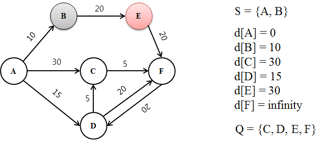 - 이제, B의 이웃 노드들을 모두 탐색하여 거리를 재고 d[N]에 기록한다. B의 이웃 노드는 E 뿐이므로, d[E] 값이 무한에서 d[B]+(B와 E 사이의 값 = 20) = 30 으로 업데이트된다.[1] 여기서 d[B] 값을 추가하는 이유는 출발지부터의 거리값을 재기 위해서다.