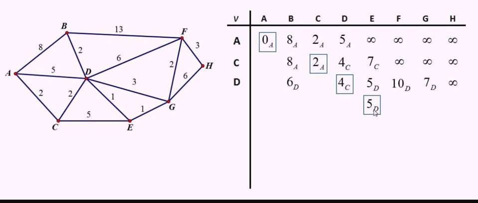 - d[F]의 경우는 원래의 값이 무한이므로, 더 작은 값인 15+20=35로 변경한다.