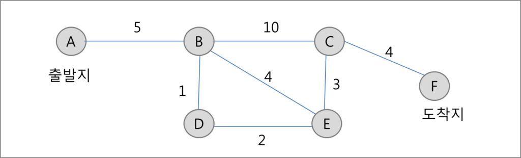 - "미방문" 상태인 모든 노드들 중, 출발점으로부터의 거리가 제일 짧은 짧은 노드 하나를 골라서 그 노드를 A에 저장한다.