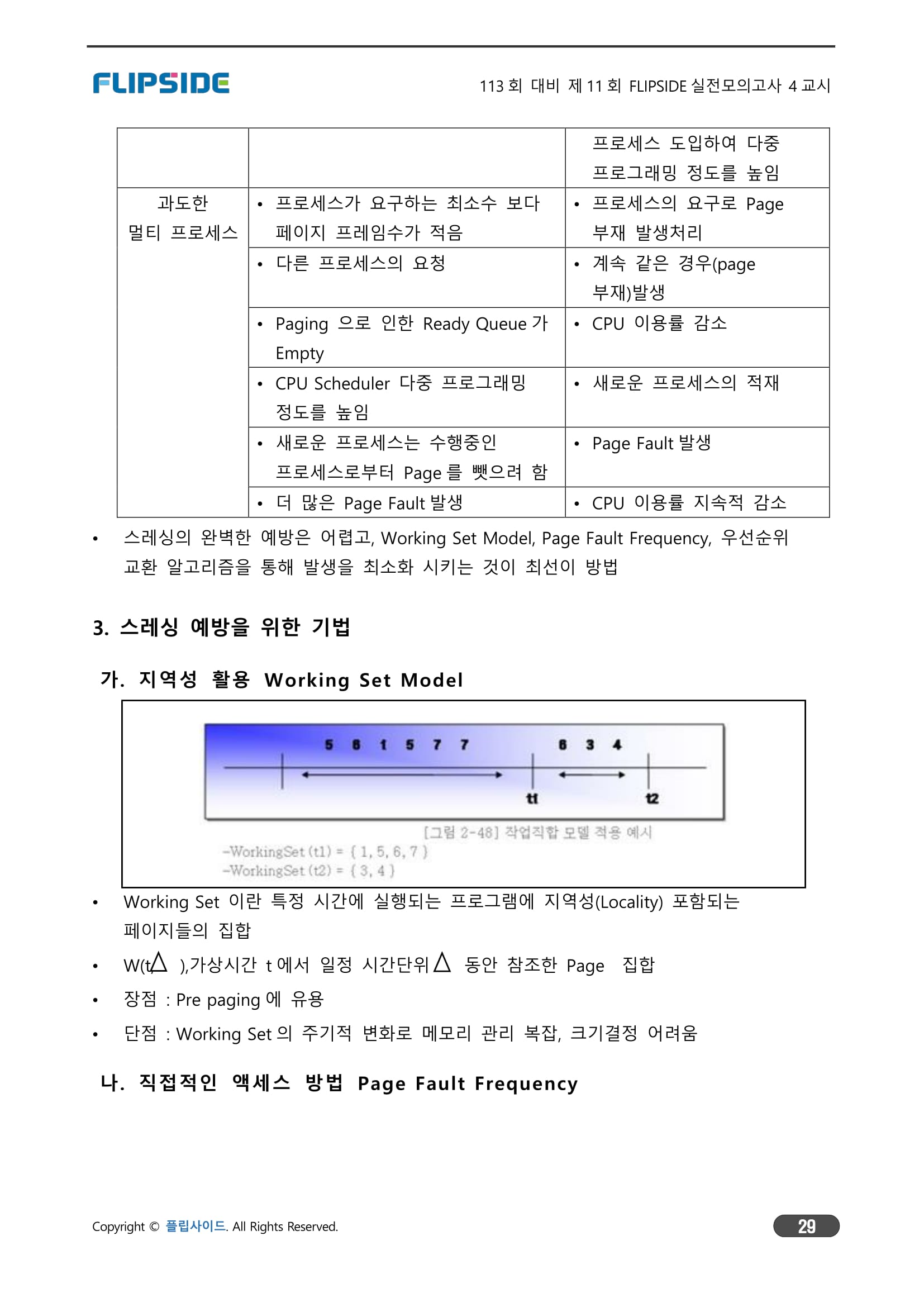 (원인) 과도한 멀티 프로그래밍 -> 메모리 부족 -> 이용율 감소 -> 스래싱 발생(부적절한 페이지 교체)