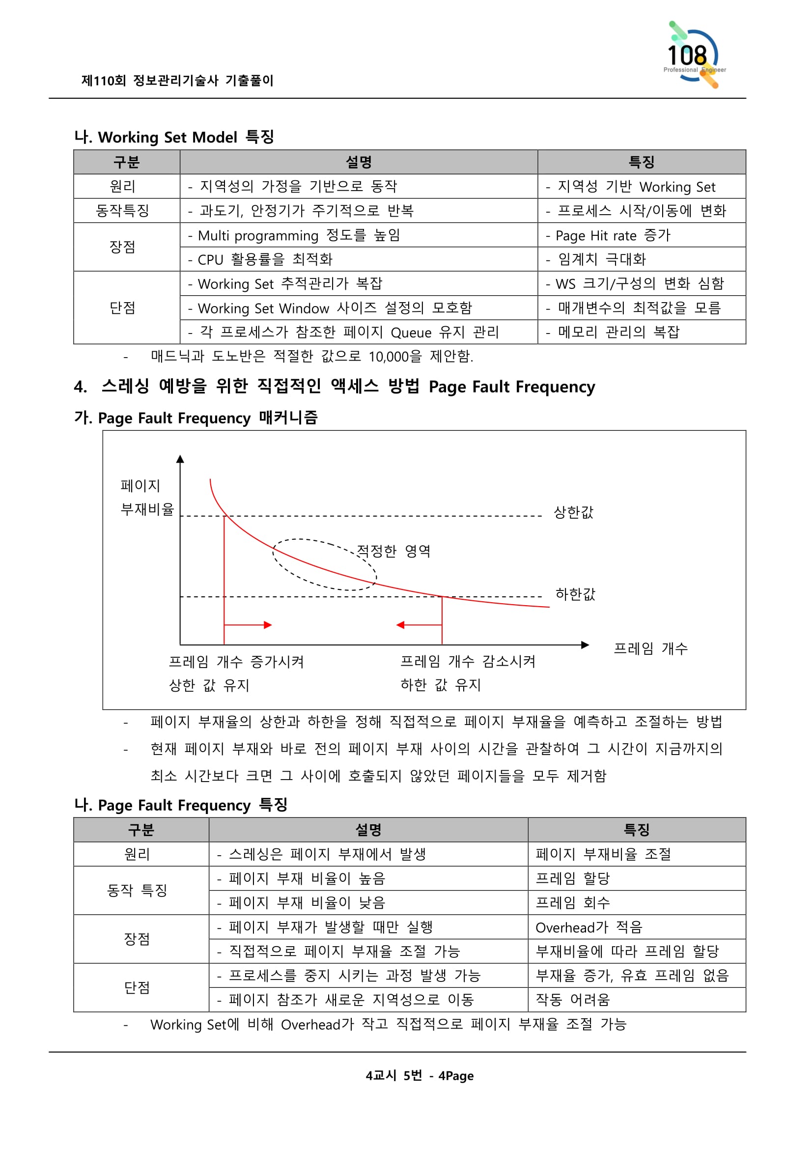 (정의) 기억장치의 페이지 부재가 비정상적으로 많이 발생하여 CPU가 프로그램 처리보다 페이지 교체에 더 많은 시간을 보내 CPU 처리 성능이 급격히 줄어드는 현상