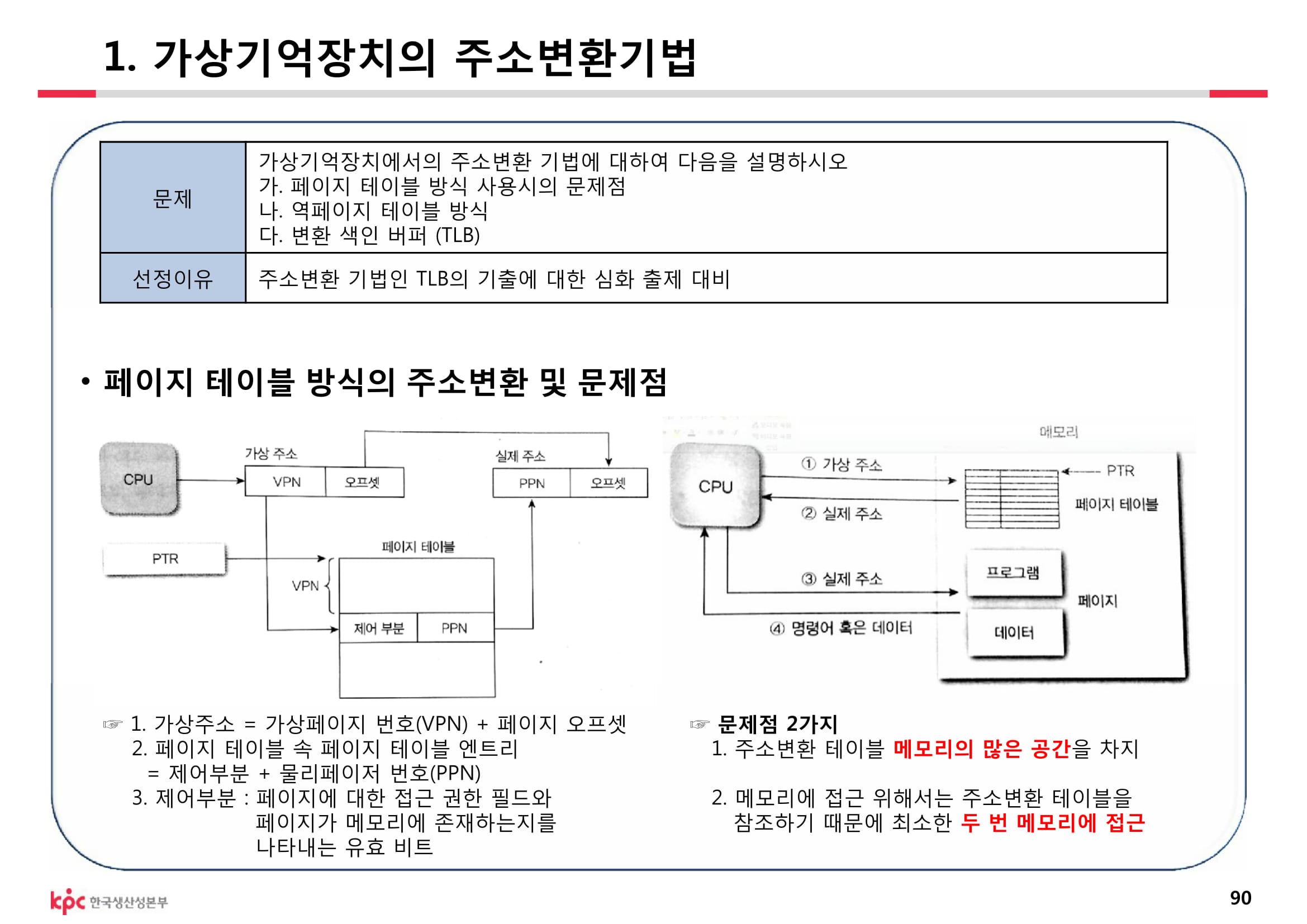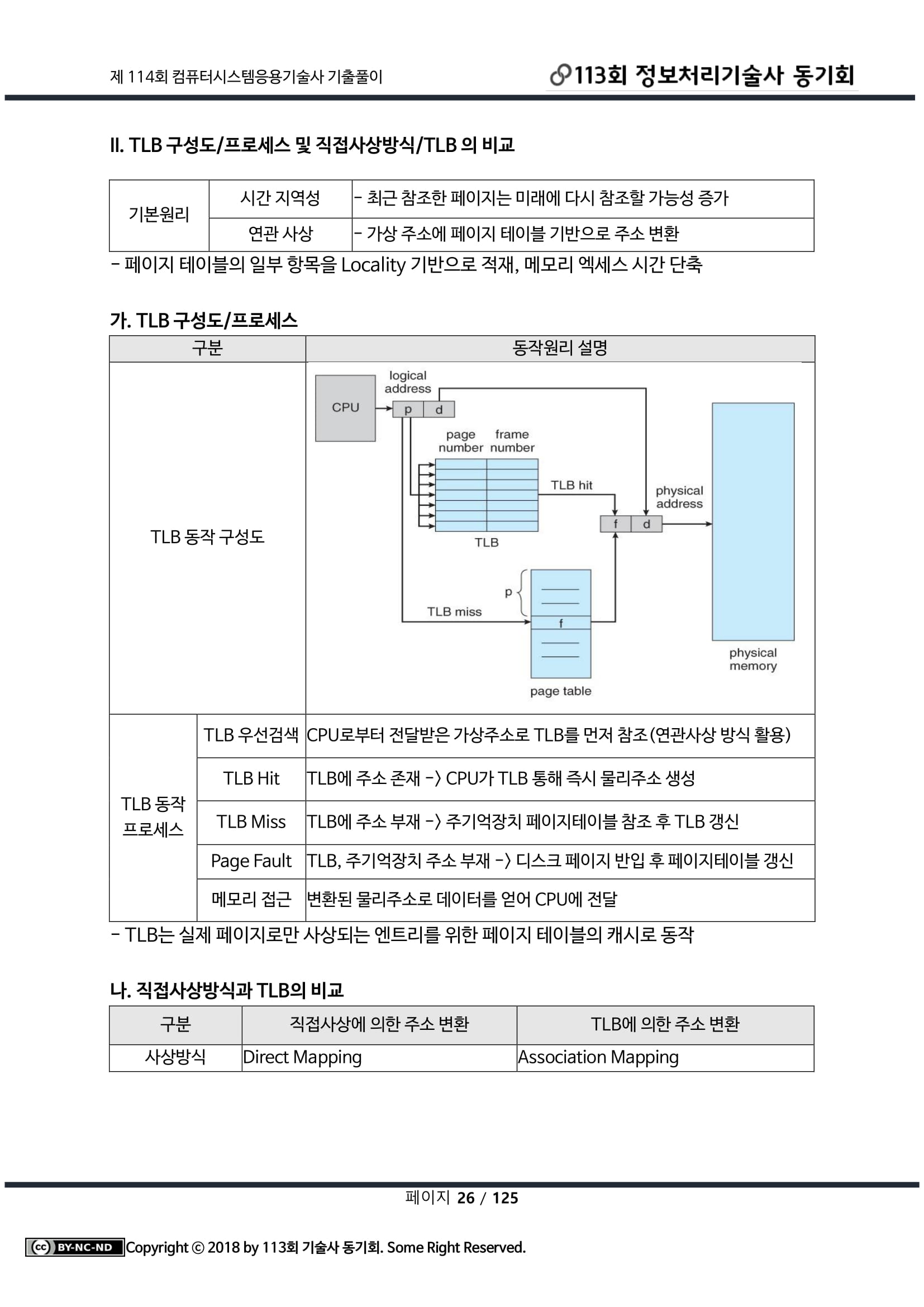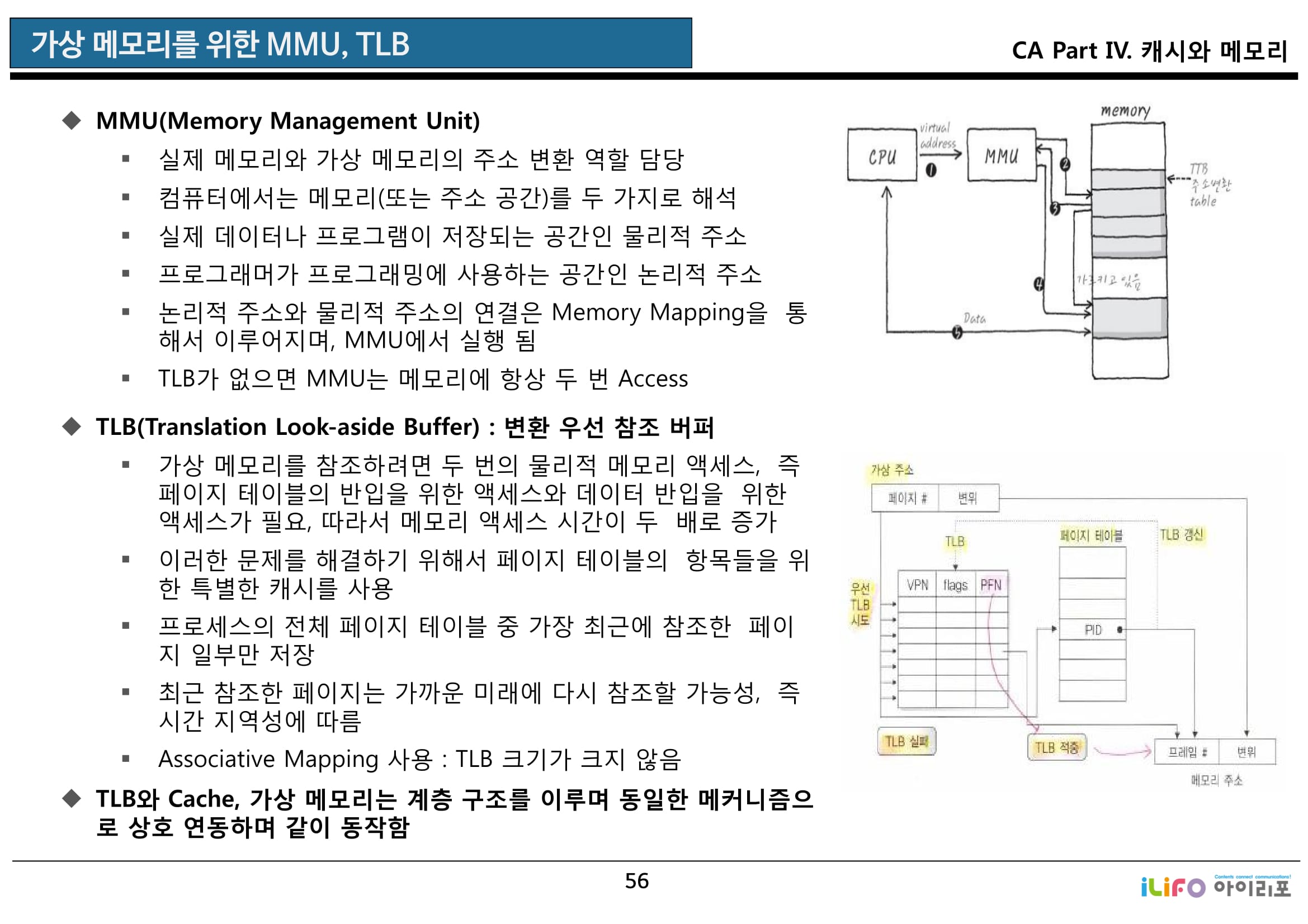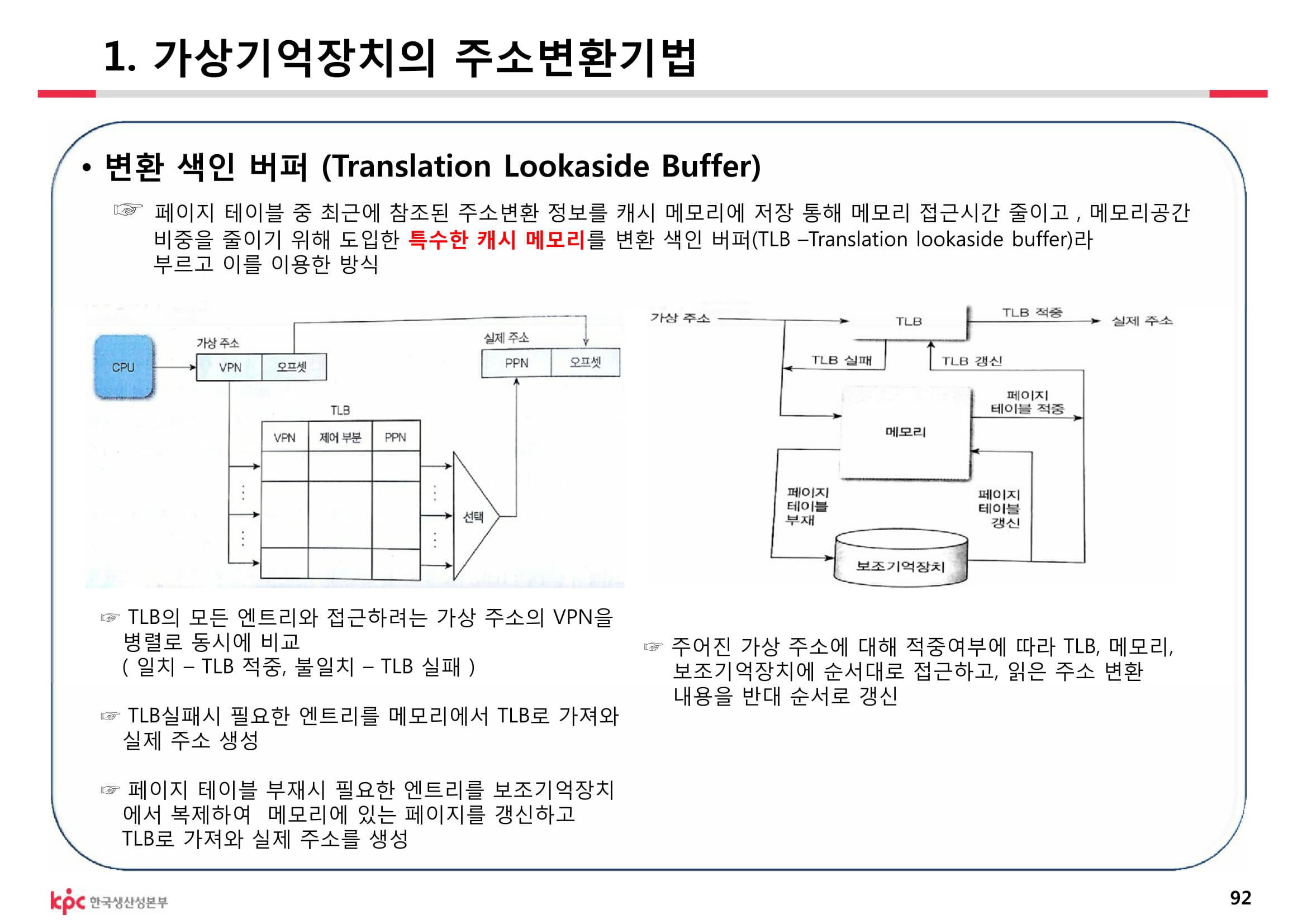 [개념] 가상 메모리 주소를 물리주소로 변환하는 속도를 높이기 위해 사용되는 고속의 캐시 메모리. 가상메모리 참조시 두번의 물리엑세스 필요사항 개선