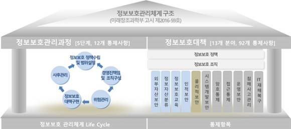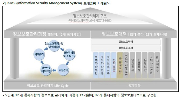 * 관리과정: 정책수립, 범위설정, 책임 및 조직, 위험관리, 정보보호대책구현, 사후관리