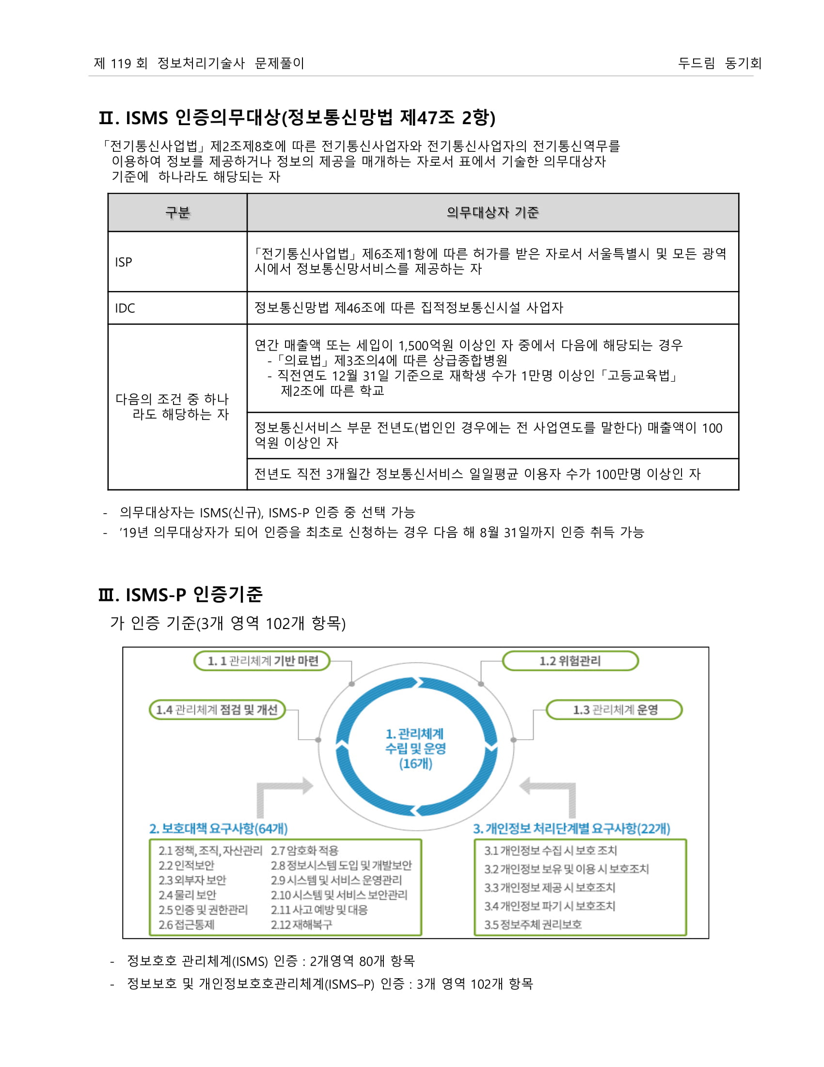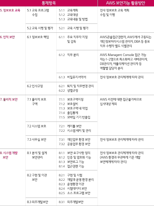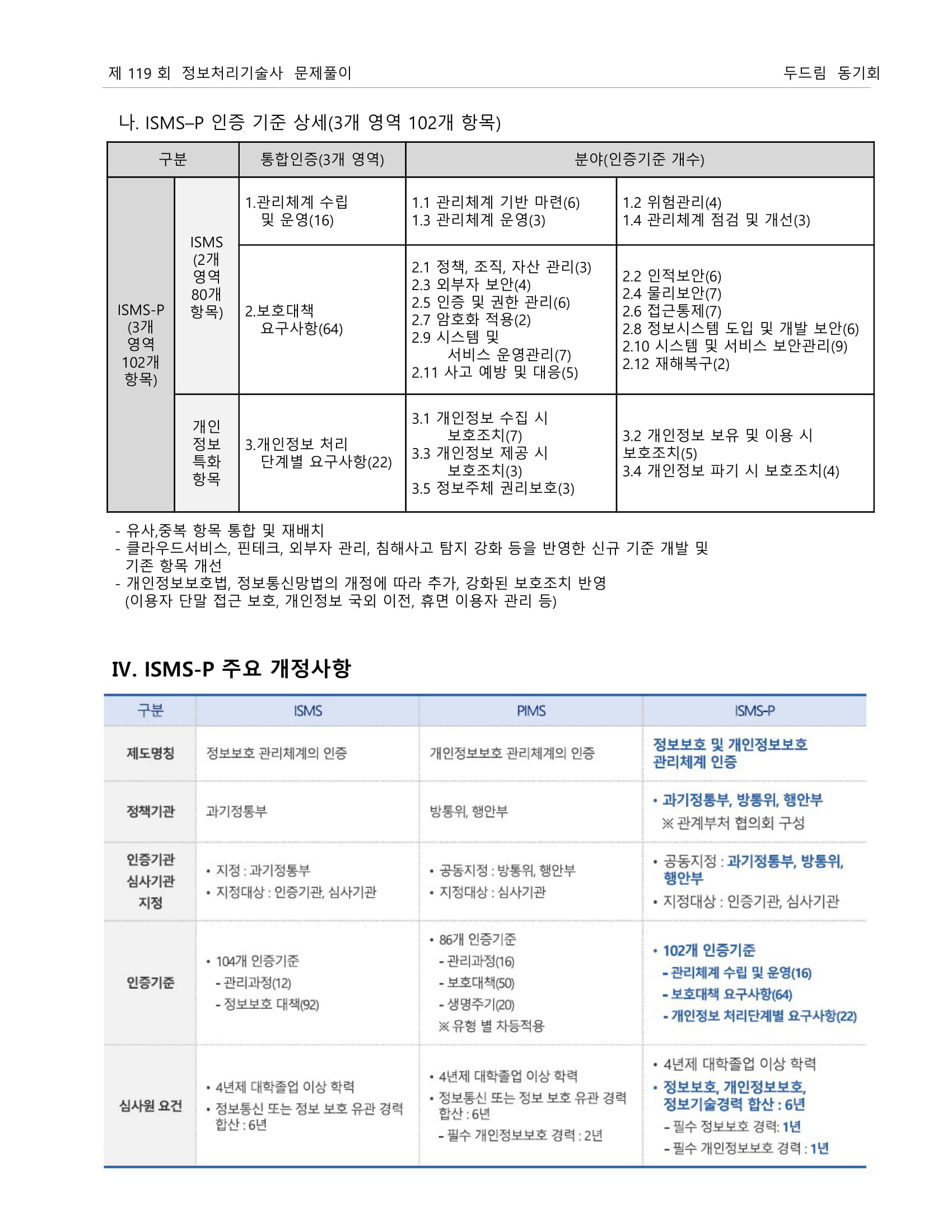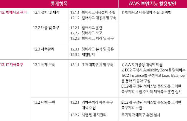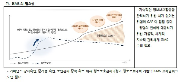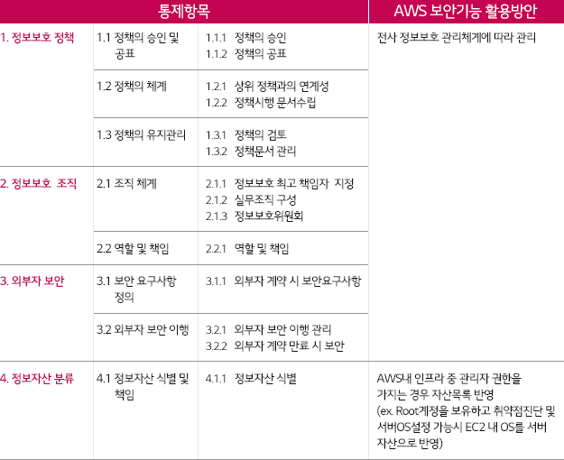 * 인증기준: 정책, 조직, 외부자보안, 자산분류, 교육훈련, 인적, 물리, 개발, 접근통제, 운영관리, 침해사고, IT재해복구