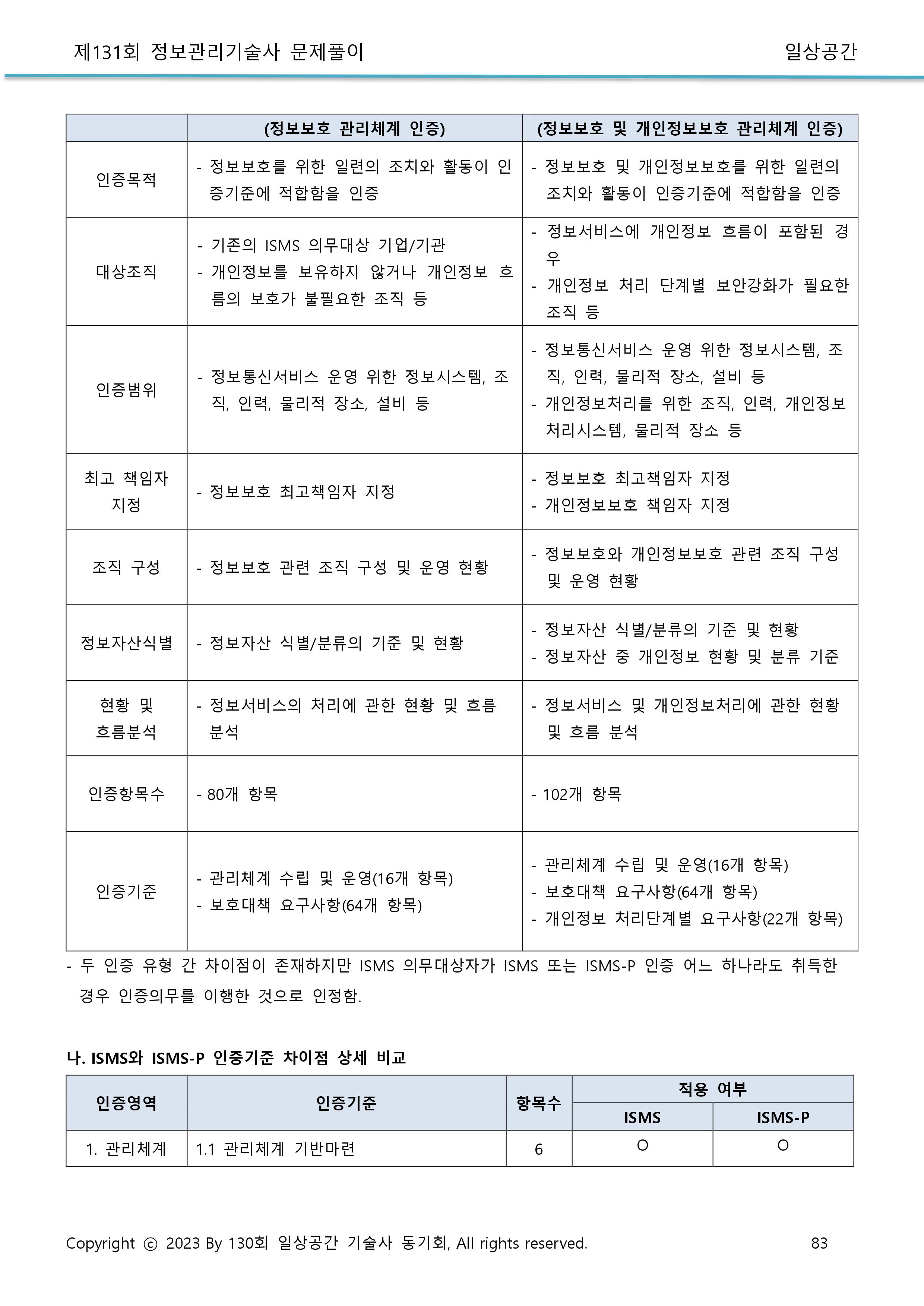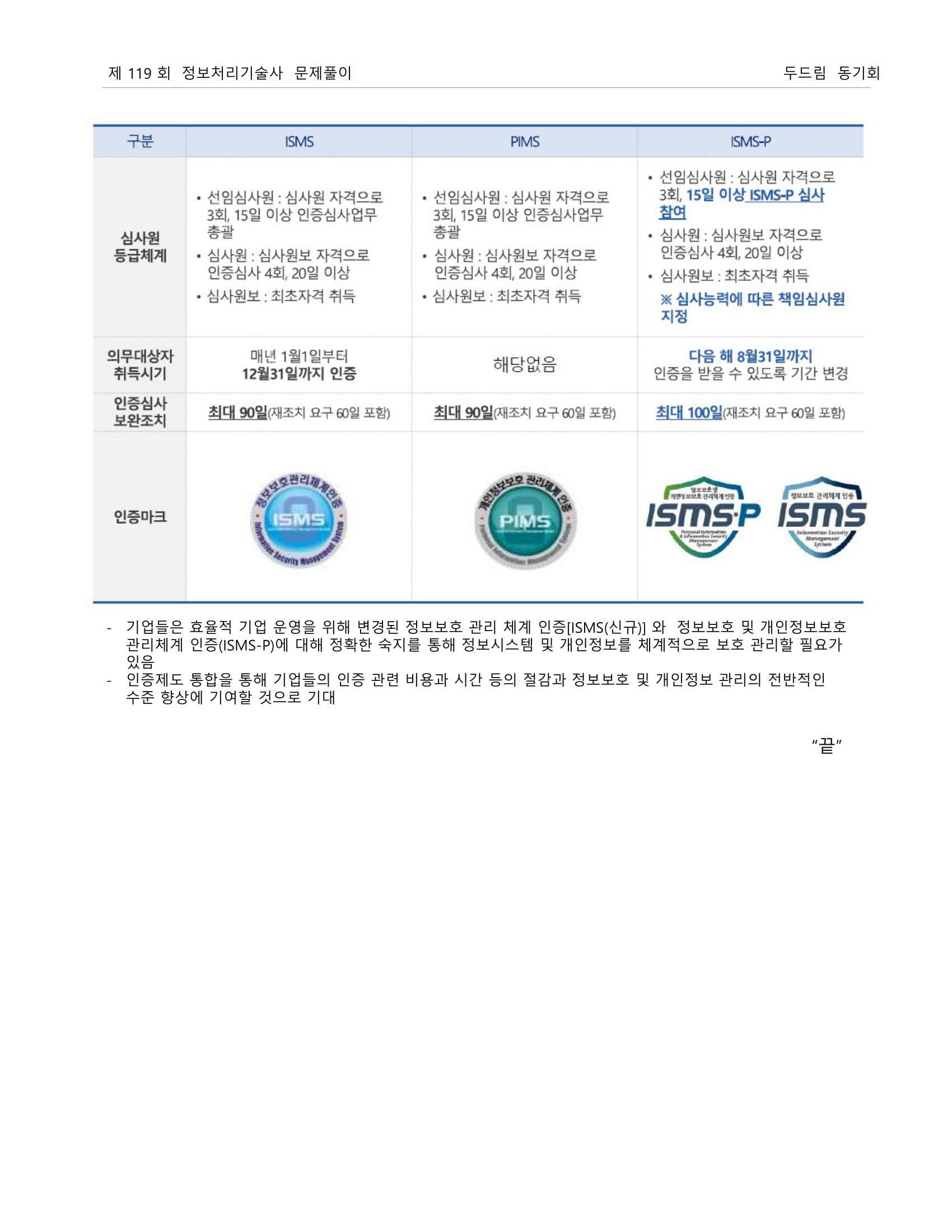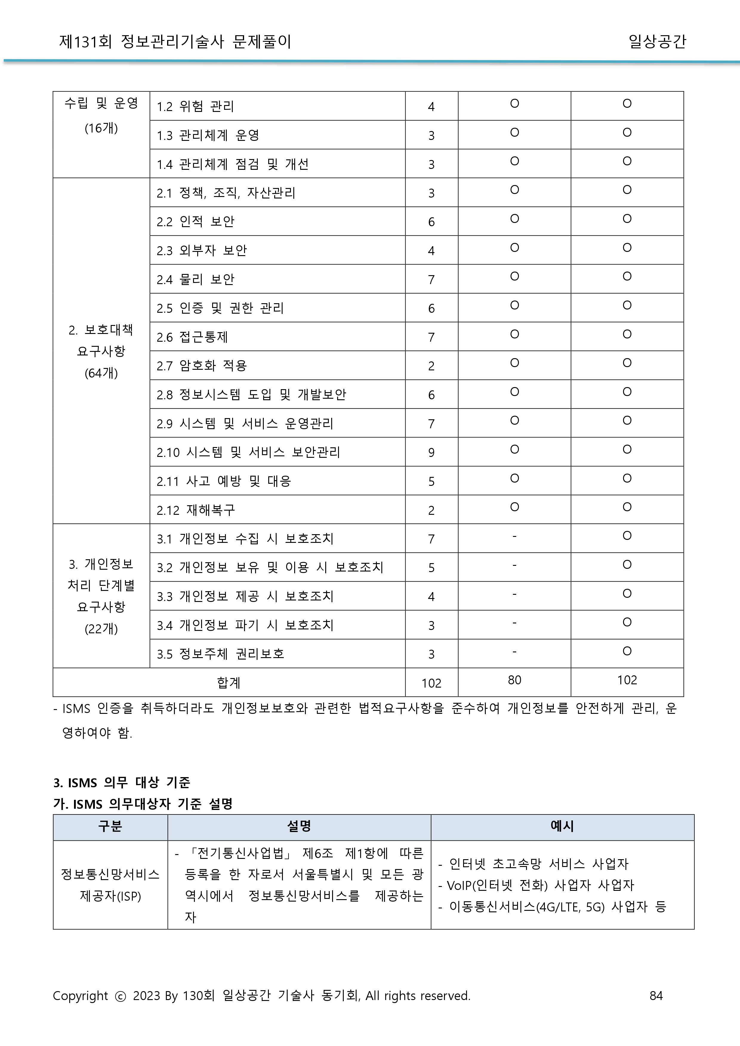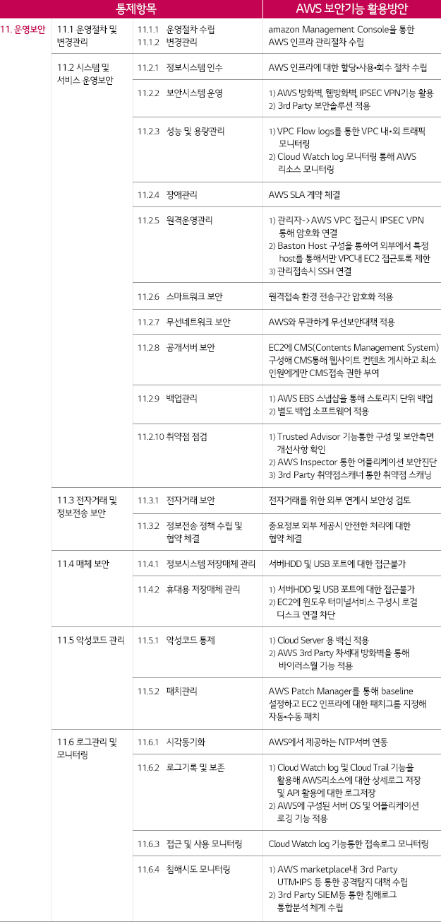 * 인증기준: 정책, 조직, 외부자보안, 자산분류, 교육훈련, 인적, 물리, 개발, 접근통제, 운영관리, 침해사고, IT재해복구