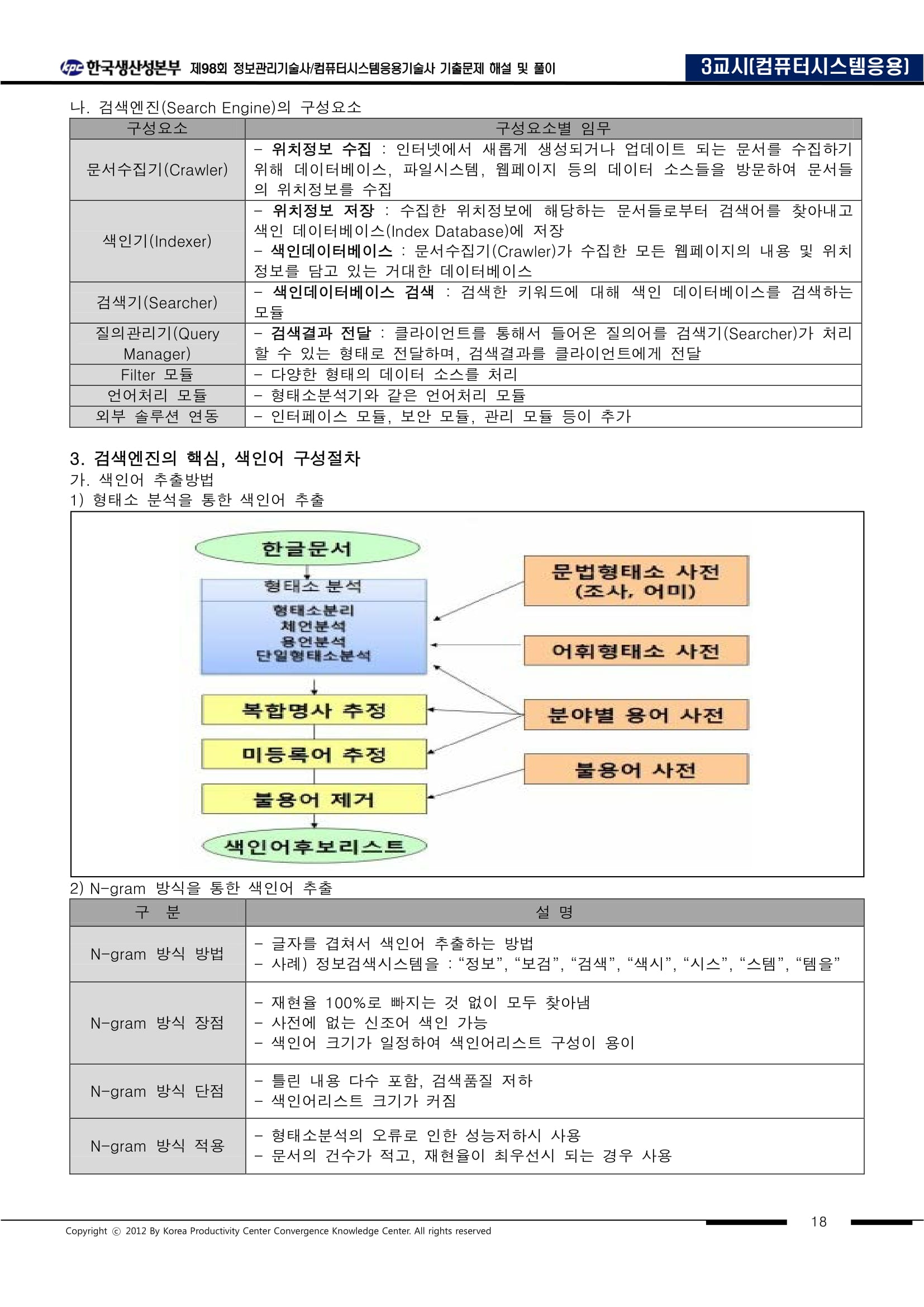 2) N-gram 방식 - 글자를 겹쳐서 색인어 추출하는 방법. 재현율 100%, 사전에 없는 신조어 색인가능. 색인어리스트 구성용이. 크기커지는 단점, 검색품질저하