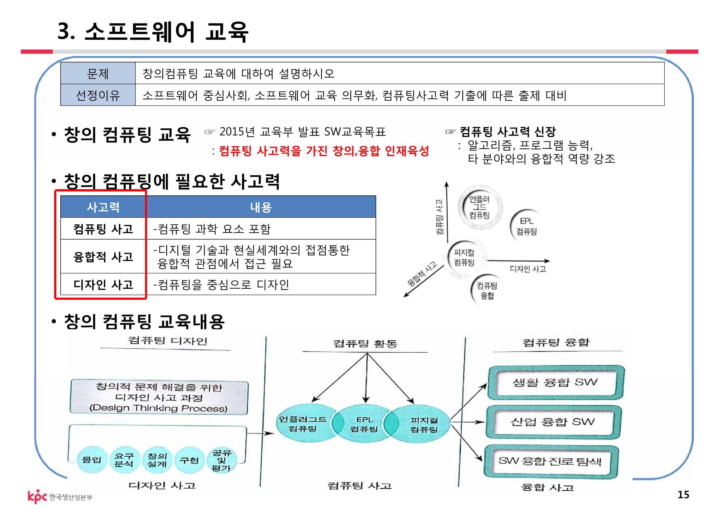 1)컴퓨팅 사고력을 함양하는 교육으로 컴퓨팅 사고력이란 컴퓨팅의 기본적인 개념과 원리를 기반으로 문제를 효율적으로 해결할 수 있는 사고 능력