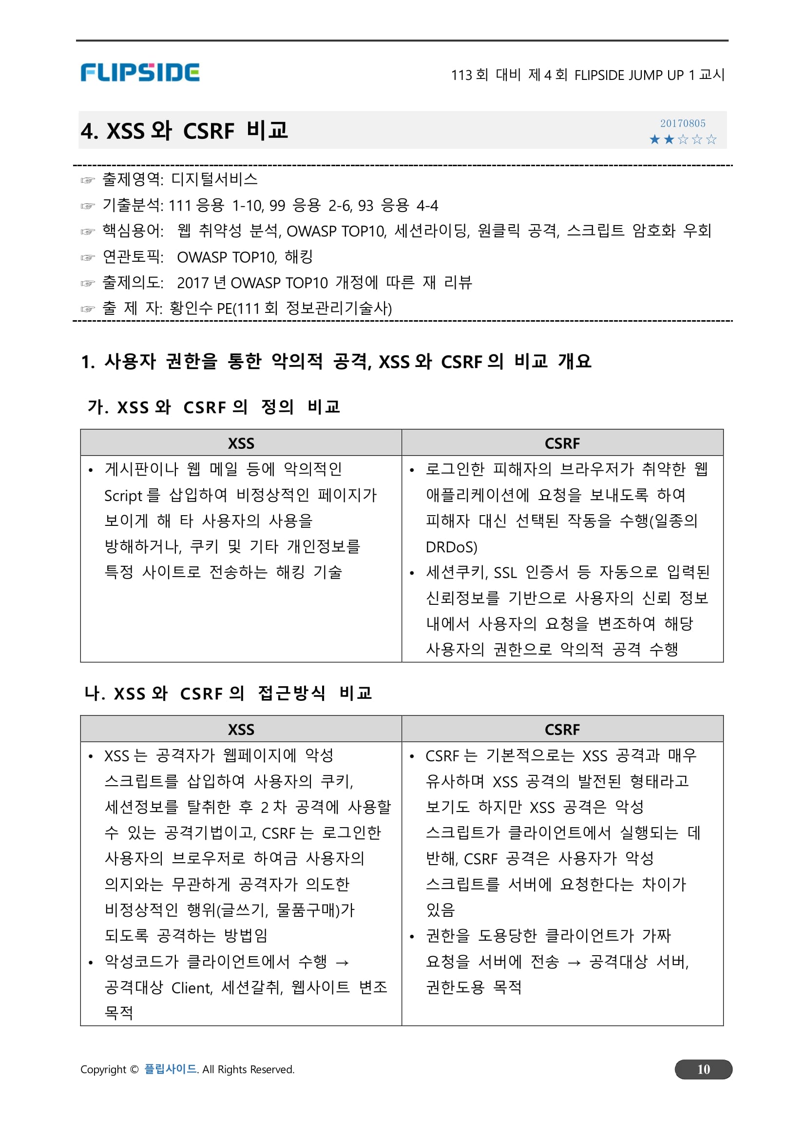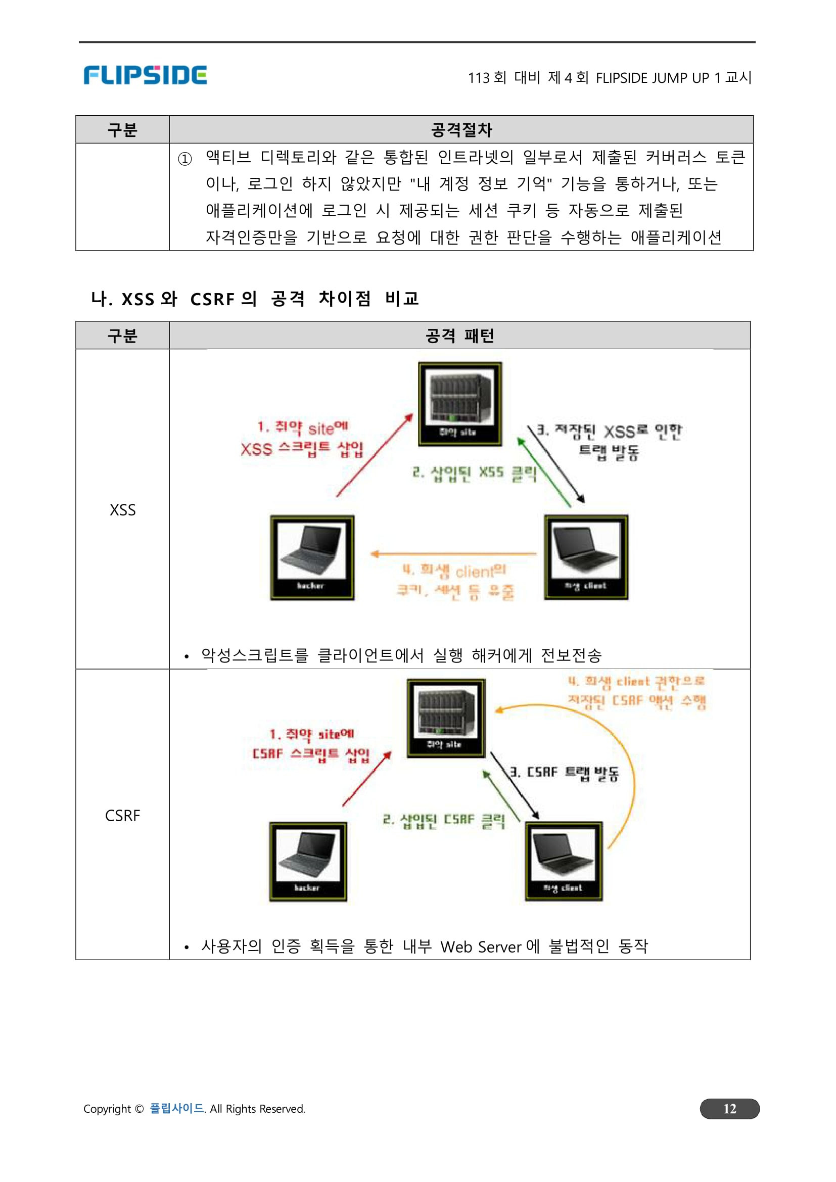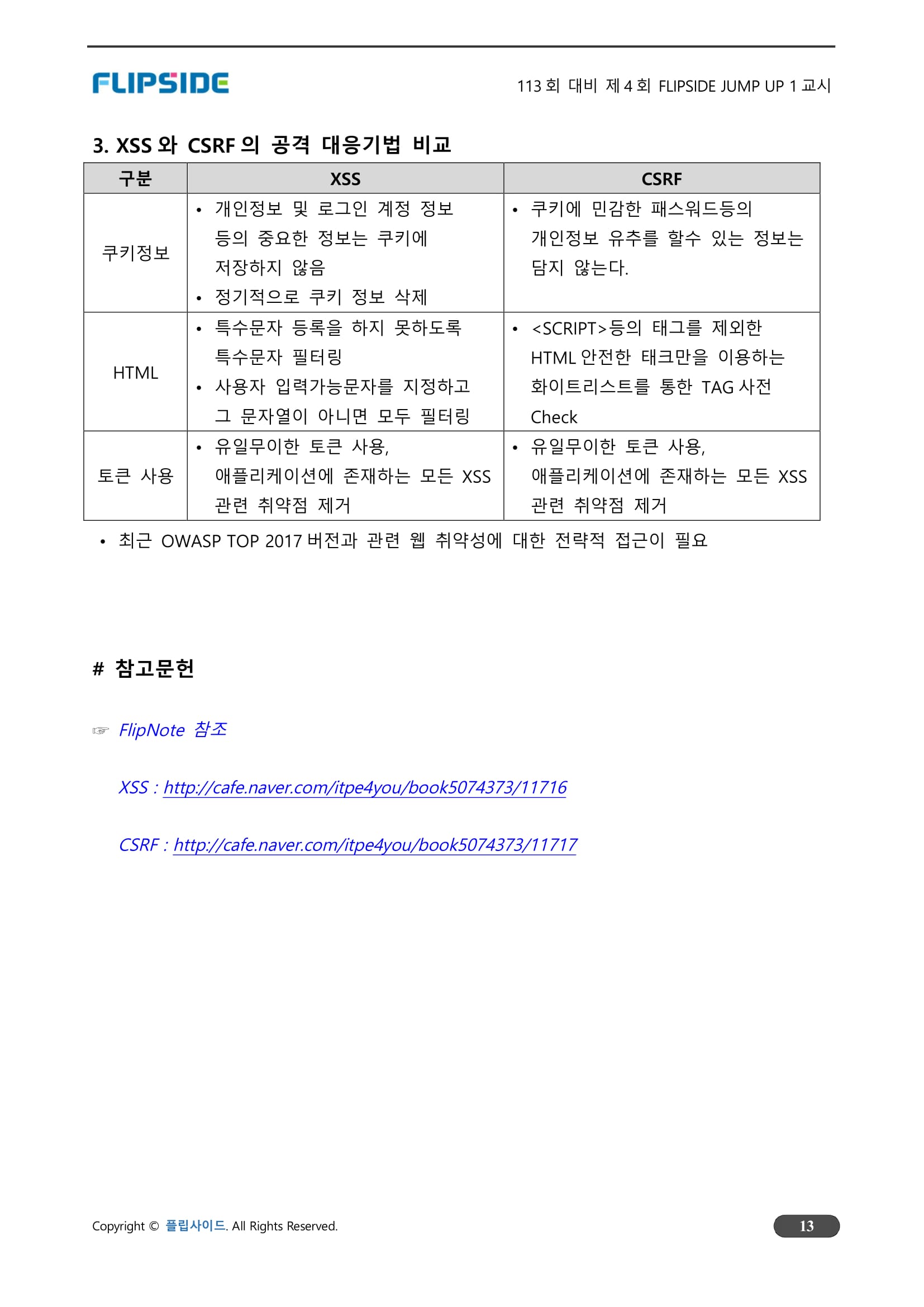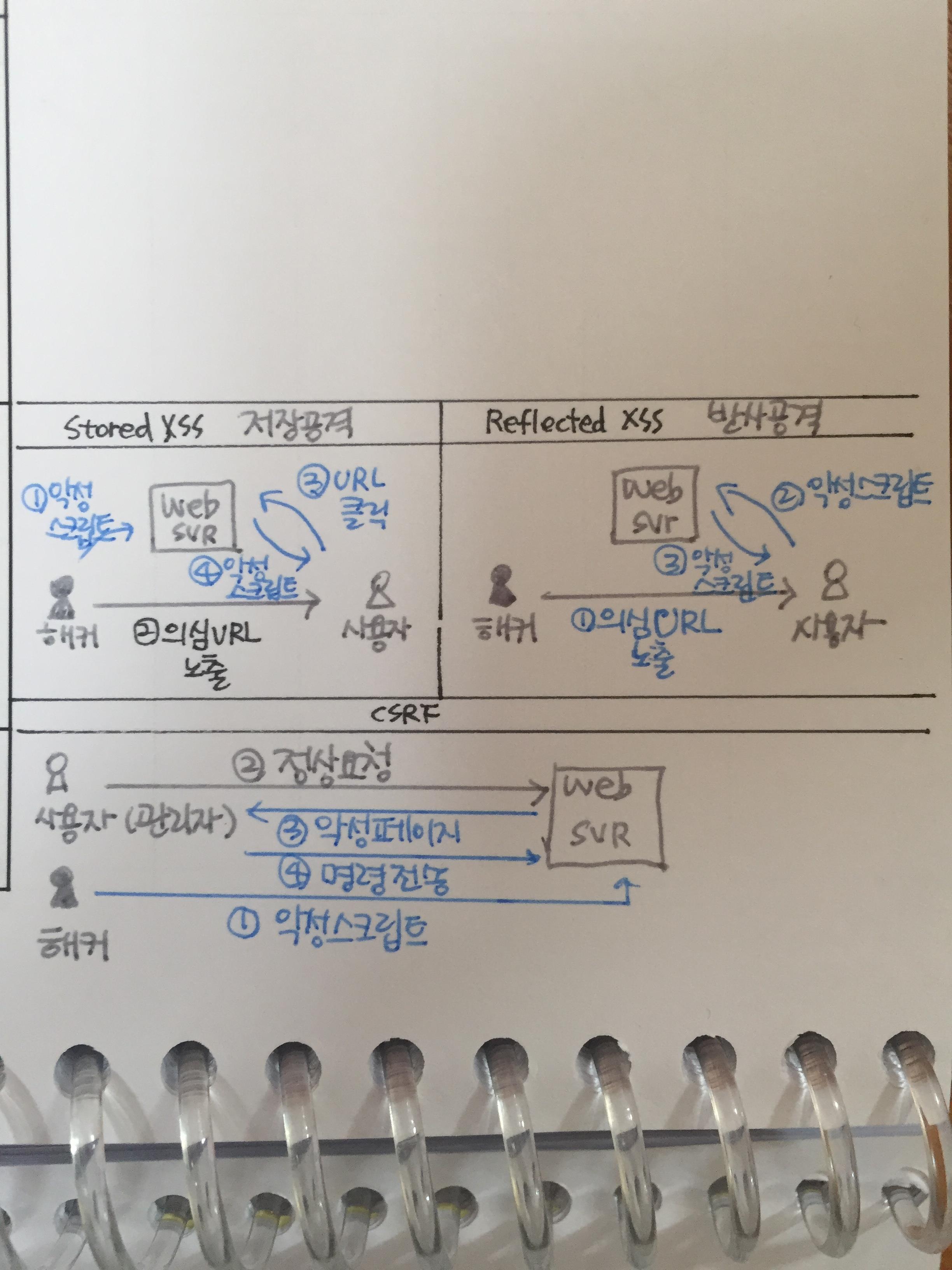 1. XSS : 웹 애플리케이션의 페이지에 악의적인 HTML, Script를 삽입하여 공격자가 원하는 형태로 공격하는 웹 해킹기법