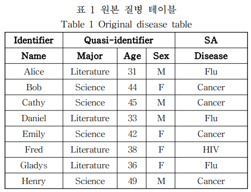 표 1의 질병 테이블에서 식별자는 이름이며 준식별자는 전공, 나이, 성별이고 민감속성은 질병명이다. 이러한 분류는 주관적이므로 비식별화 담당자의 판단과 상황에 따라 달라질 수 있다.