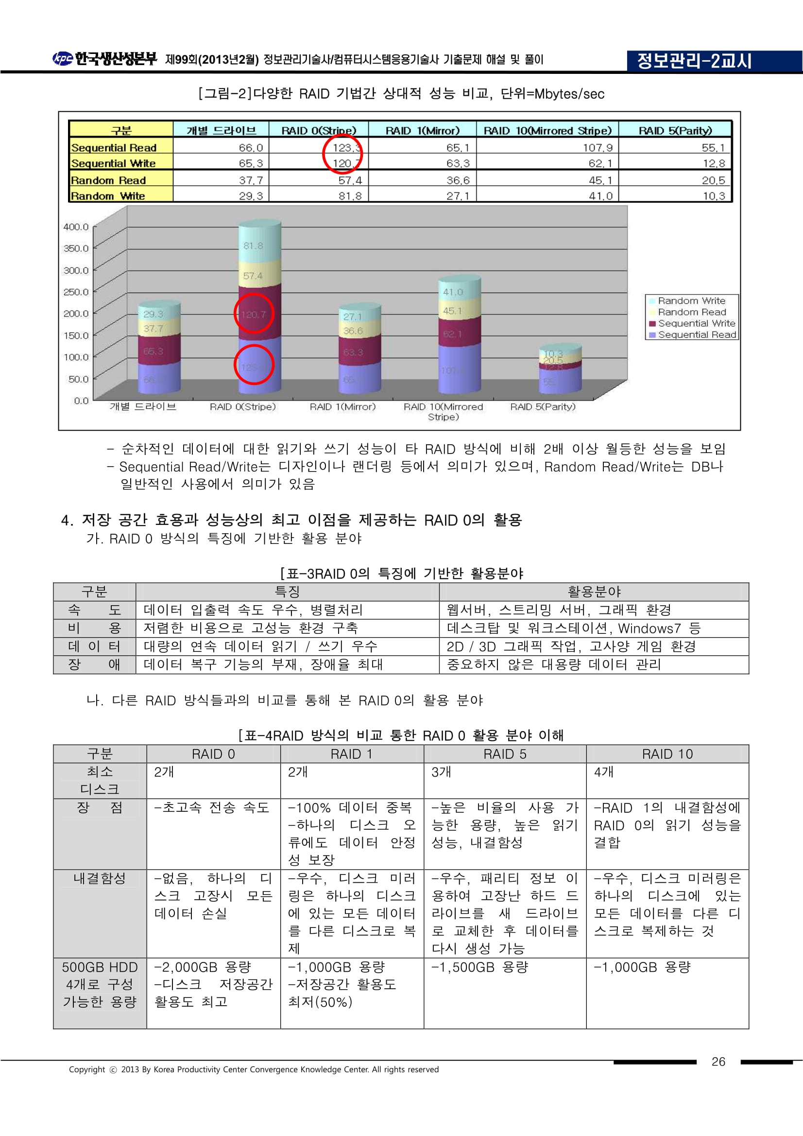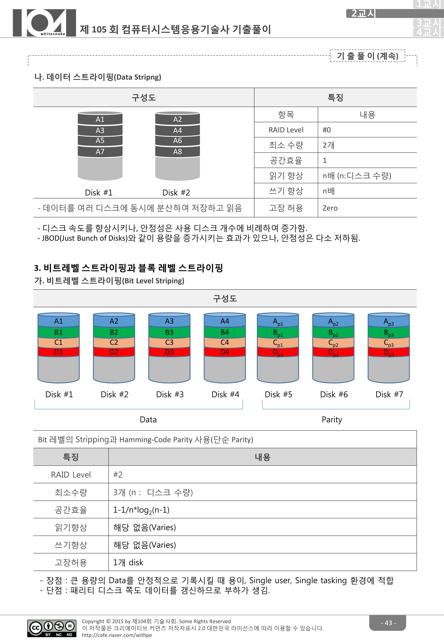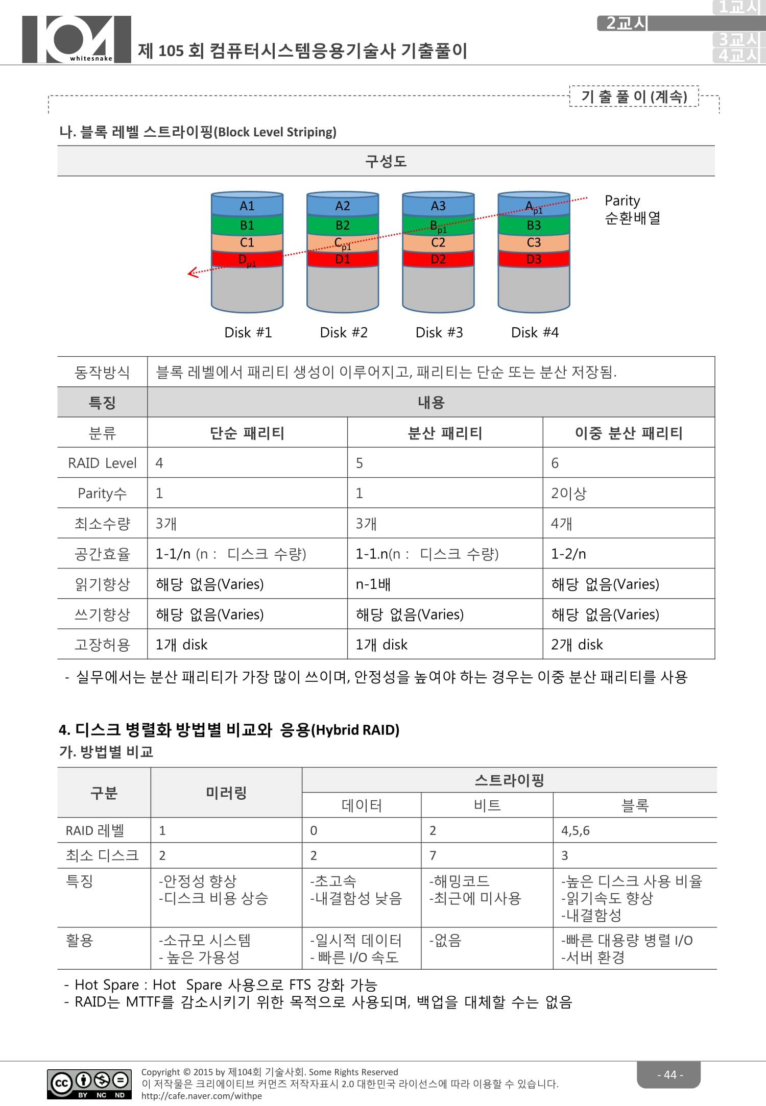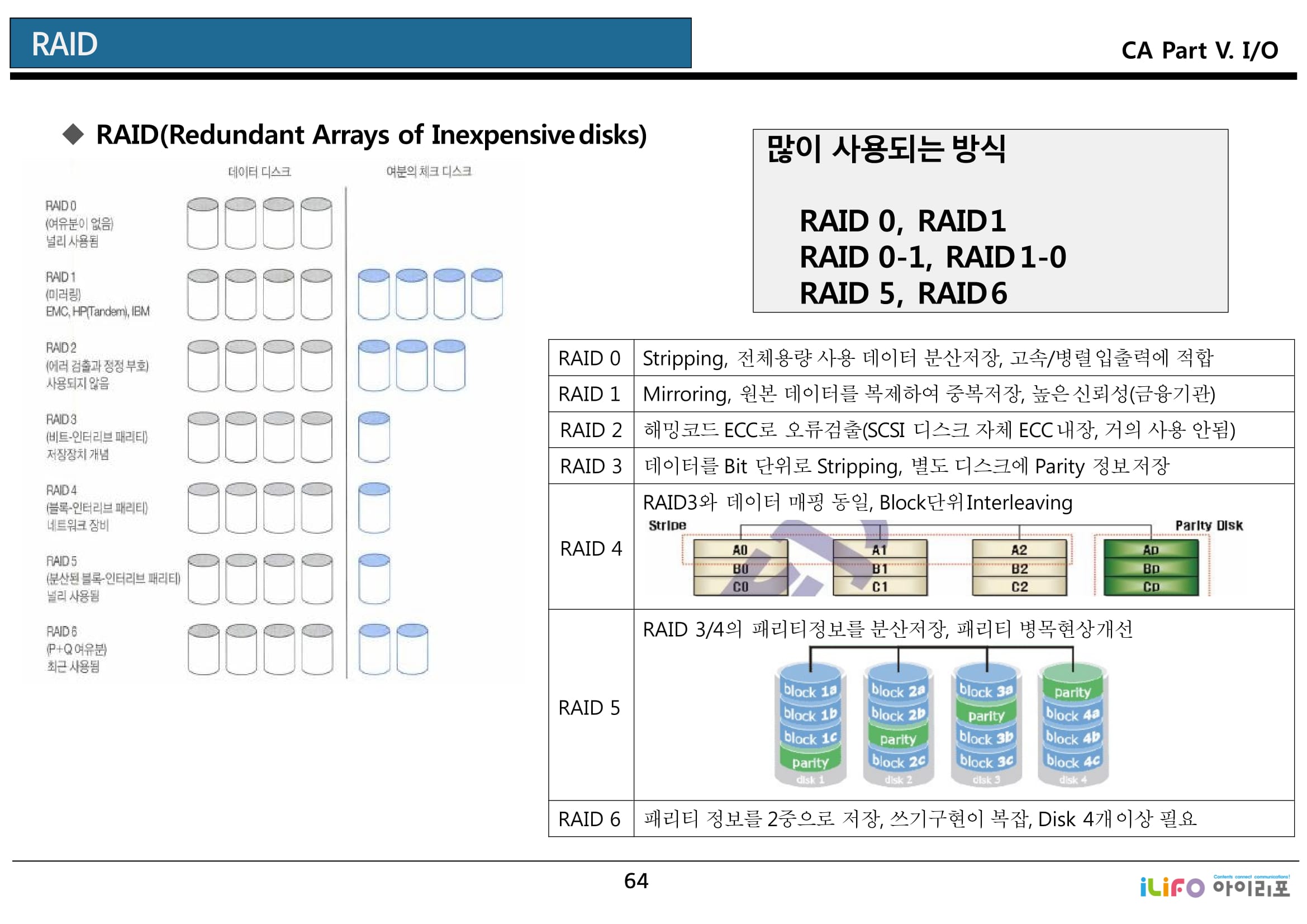 RAID 4 - Block단위 저장. RAID 0구성에 백업용 드라이브 추가하여 안전성확보RAID 5 - 패리티정보 분산저장.병목줄임.Read시 패리티정보 갱신통한 성능저하 . 컨트롤러에 지능형 캐시 내장하여 저하 최소화 수행