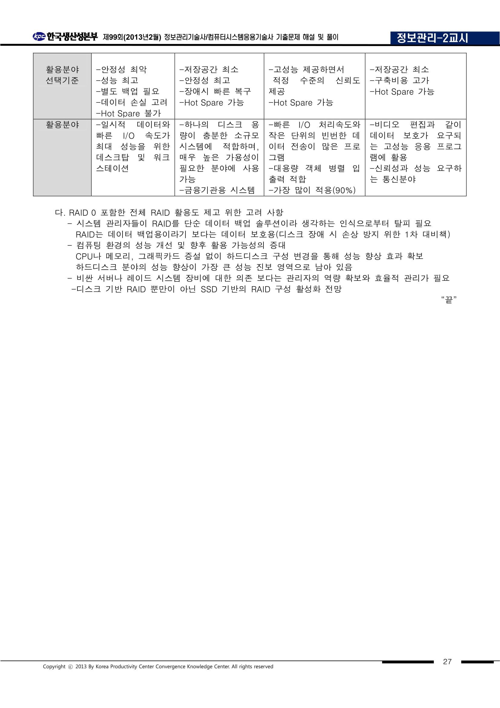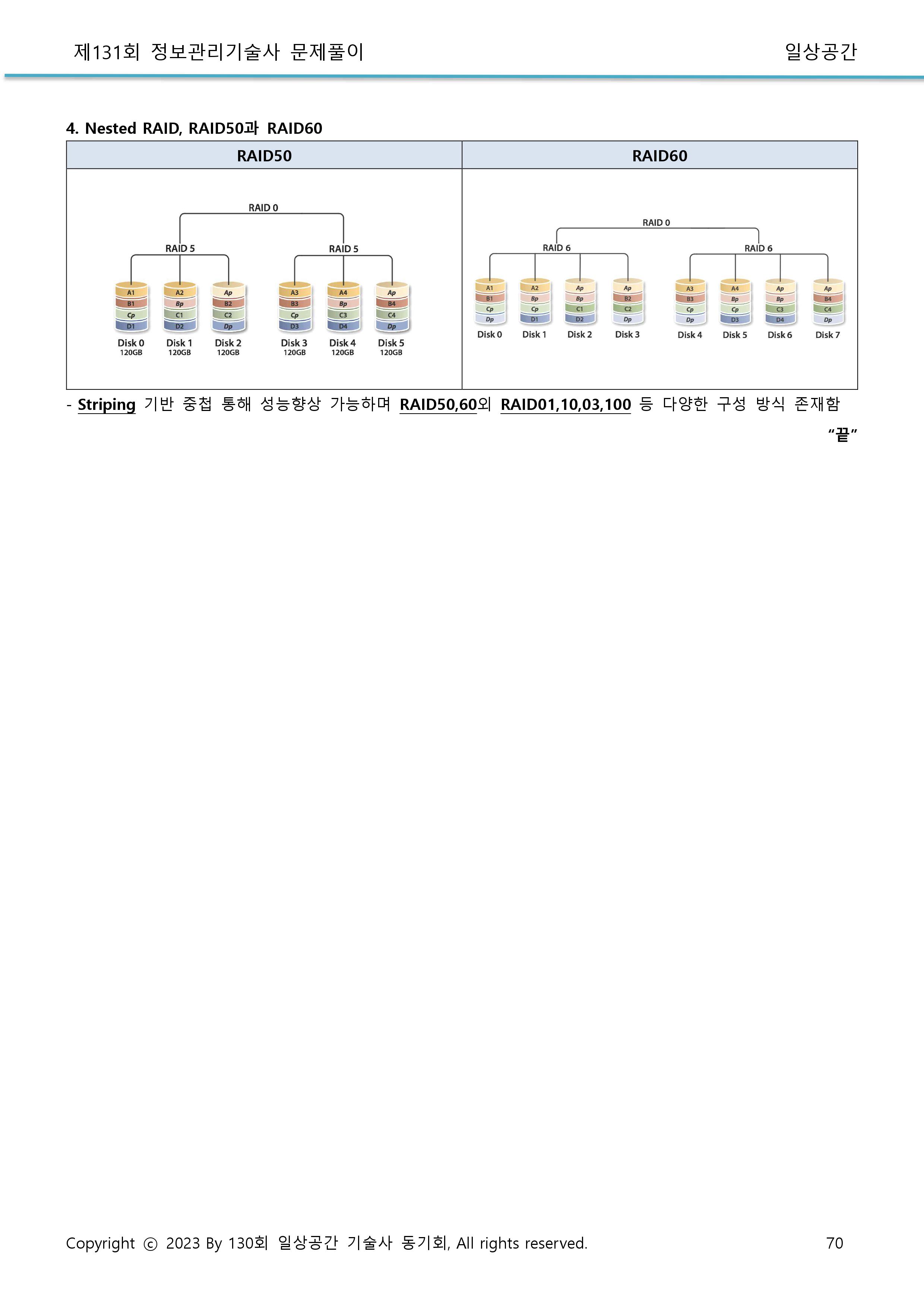 RAID6 - 2차 패리티 정보 삽입. 2개의 하드 문제시 복구가능. RAID5+안정성