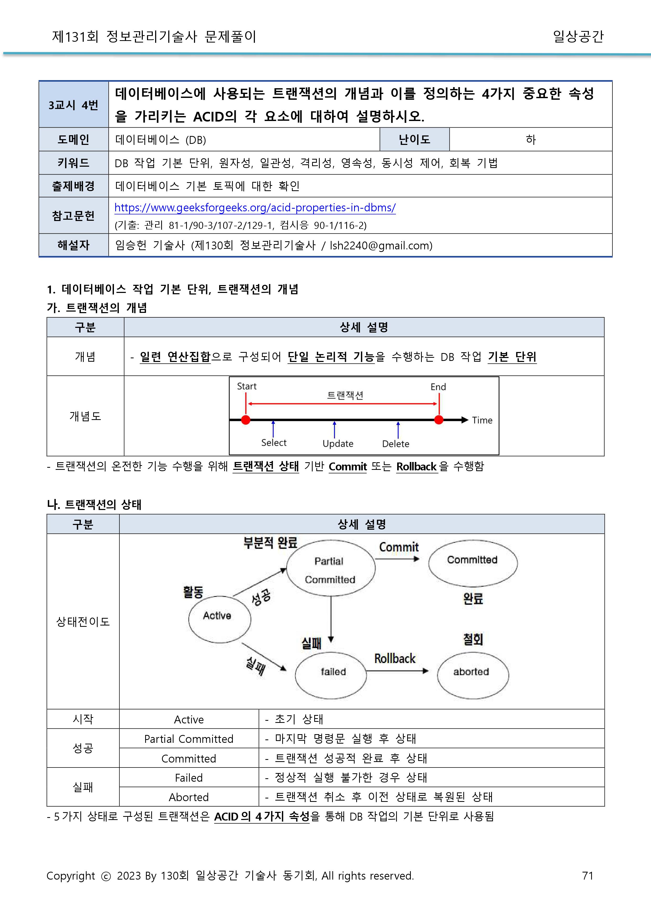 - 데이터 트랜잭션이 안전하게 수행된다는 것을 보장하기 위해 데이터 베이스가 가져야 하는 성질 4 가지.