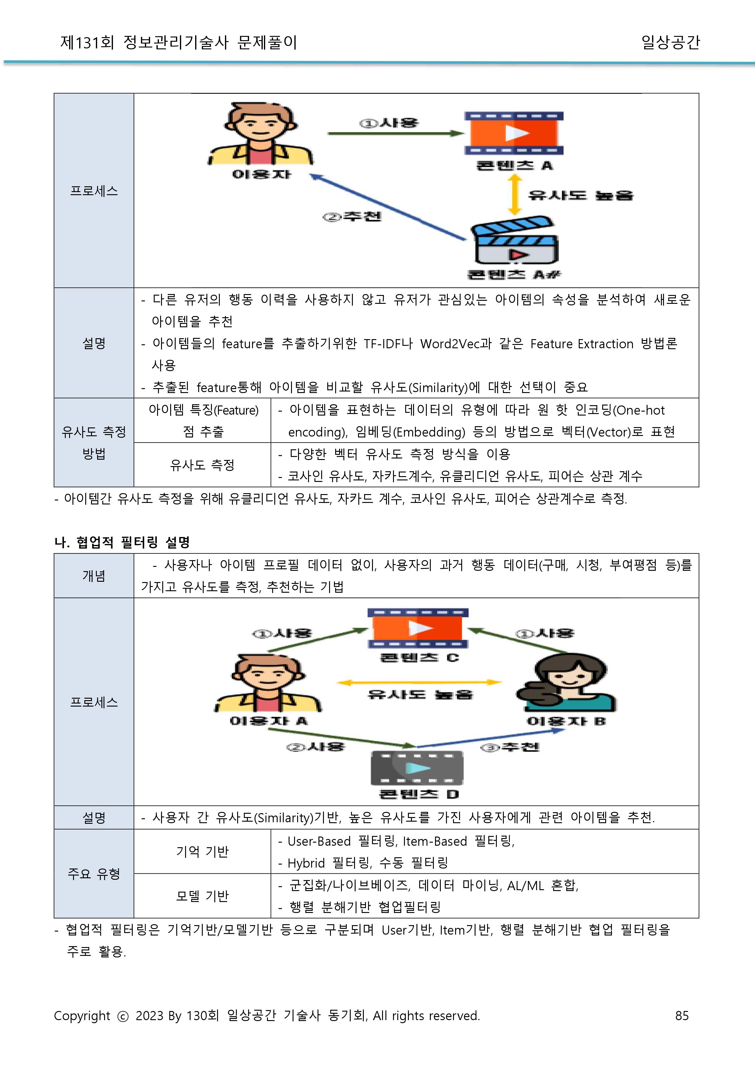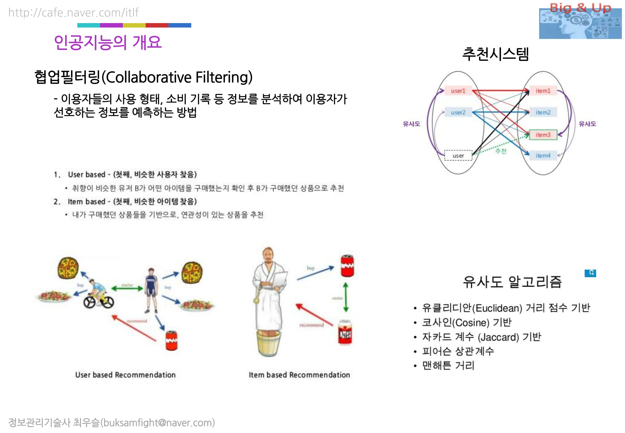 추천 엔진의 이해 1. 추천 시스템의 진화 2. 최근접 이웃 기반 추천 2. 1. 사용자 기반 협업 필터링 2. 2. 아이템 기반 협업 필터링 3. 콘텐츠 기반 추천 시스템 3. 1. 아이템 프로필 생성 3. 2. 사용자