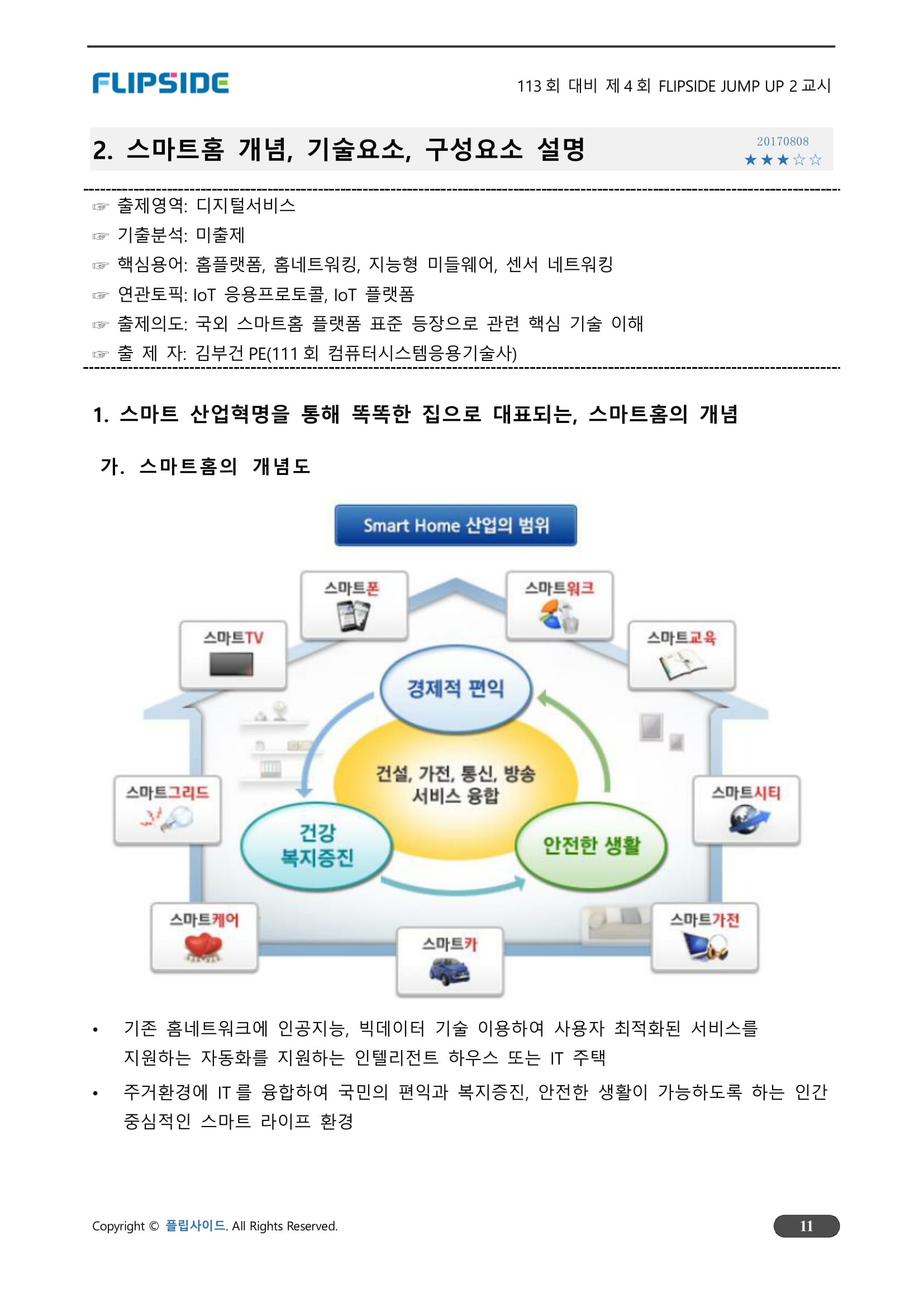 가전제품, 전기·수도·냉난방 등 에너지 소비장치, 보안기기 등 모든 집안 장치를 연결해 제어하는 기술 또는 이런 기술이 적용된 집을 말한다. 인공지능(AI) 스피커나 스마트폰으로 TV와 냉난방을 켜고 끄는 것은 물론 검색 결과 영상재현, 쇼핑도 가능하다.