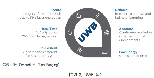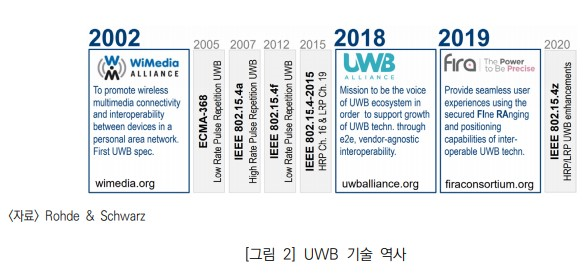 500MHz 이상의 넓은 주파 수 폭, 낮은 출력의 전파를 사용하는 100m 이내의 무선통신 기술