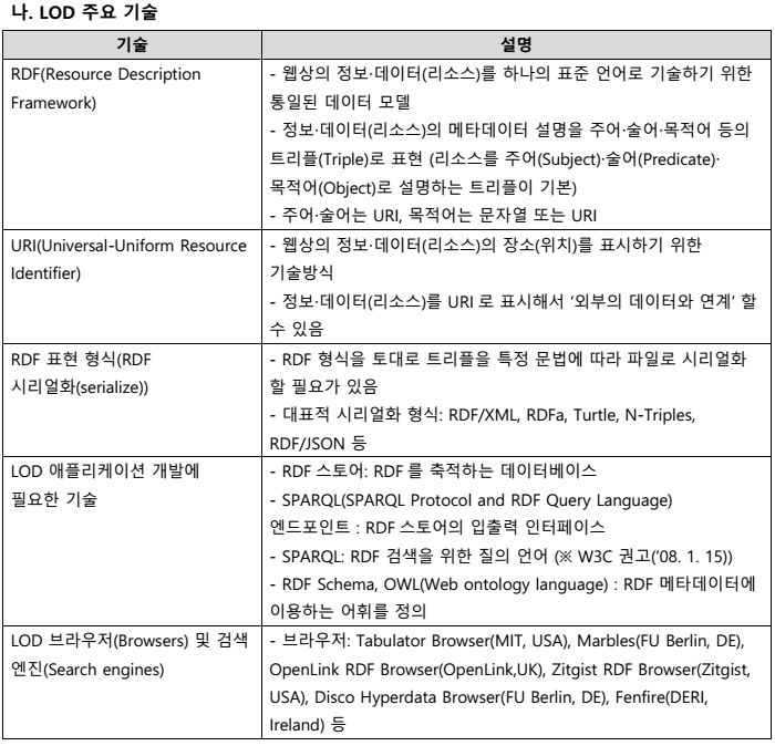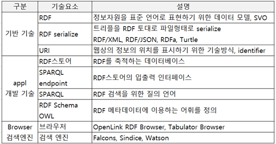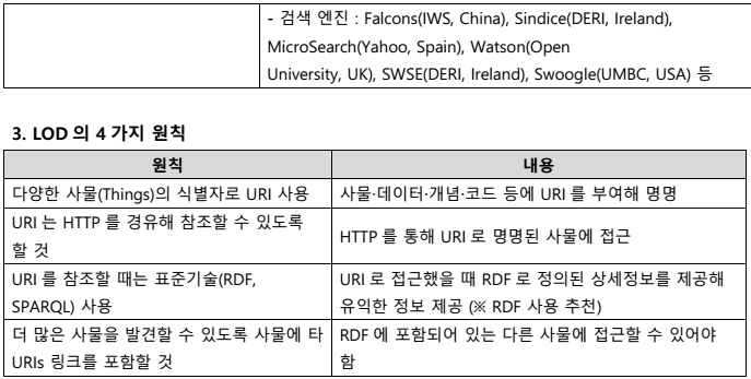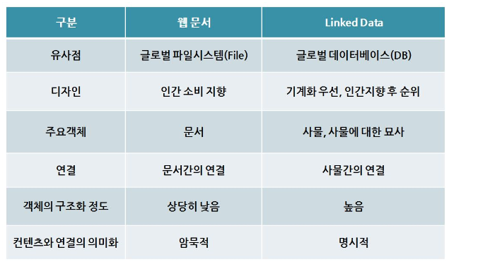 - RDF 형식의 데이터 표현과 출판, REST 프로토콜과 SPARQL을 통한 검색과 질의를 제공하며 URI를 통해 모든 데이터가 연결 가능한 웹을 지향