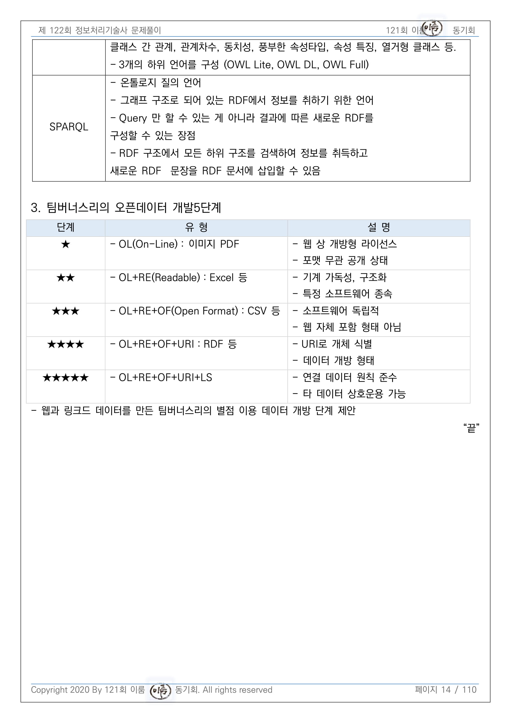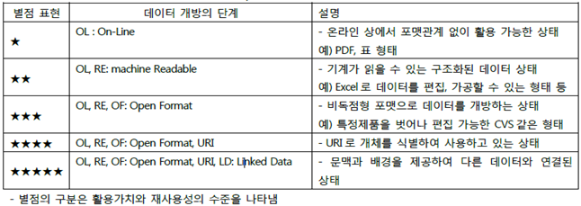 [팀버너스리의 데이터 개방단계](on-line, machine readable, open format, URI Identification, Linked Data) PDF->XLS->CSV->RDF->LOD