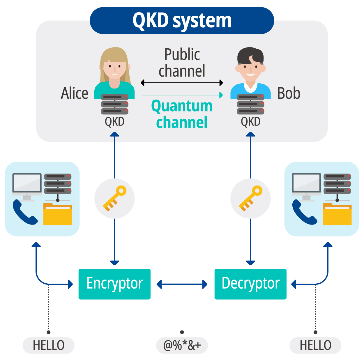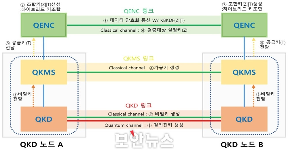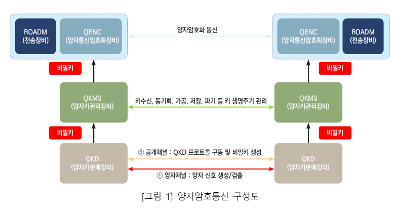양자 암호 키 분배 시스템(QKD system)으로 송신부와 수신부는 서로 같은 양자 암호 키를 안전하게 분배하여 가진다.