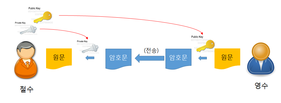 철수는 개인키와 공개키를 가지고 있는 상태에서, 철수의 공개키는 아무나 제공받을 수 있죠. 영수는 철수의 공개키를 이용해서 원문을 암호화하여 전송하면, 해당 공개키의 쌍이 되는 개인키는 오직 철수만이 가지고 있어서 철수만이 복호화 가능합니다.