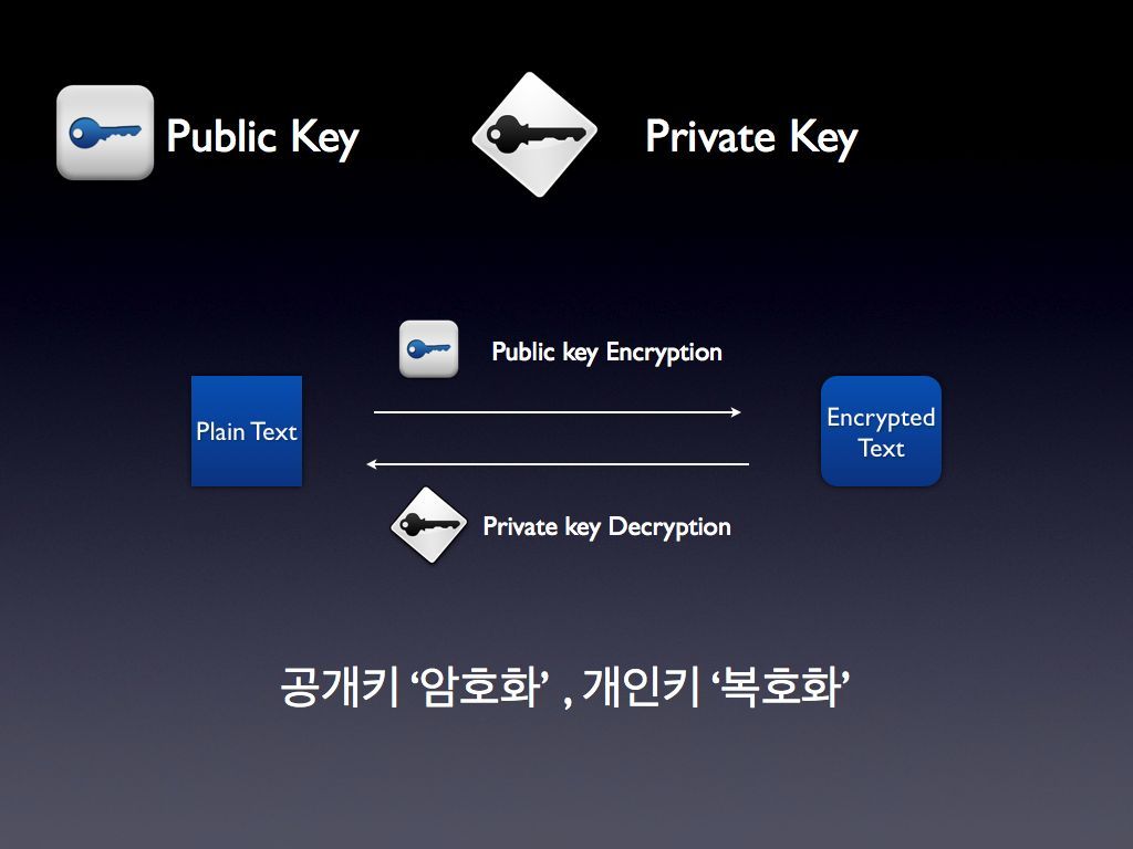 암호를 하는 사람은 먼저 키 생성을 합니다. 이 때  키1쌍(개인키/공개키)이 생성되고 이 둘의 키만이 서로 암호화와 복호화를 가능하게 해줍니다.그리고 개인키는 자신만이 소유하고 절대 외부에 노출하지 않습니다. 공개키는 나와 암호통신을 하고자 하는 사람에게 얼마든지 제공할 수 있습니다. RSA, ECC 등의 알고리즘이 있죠.