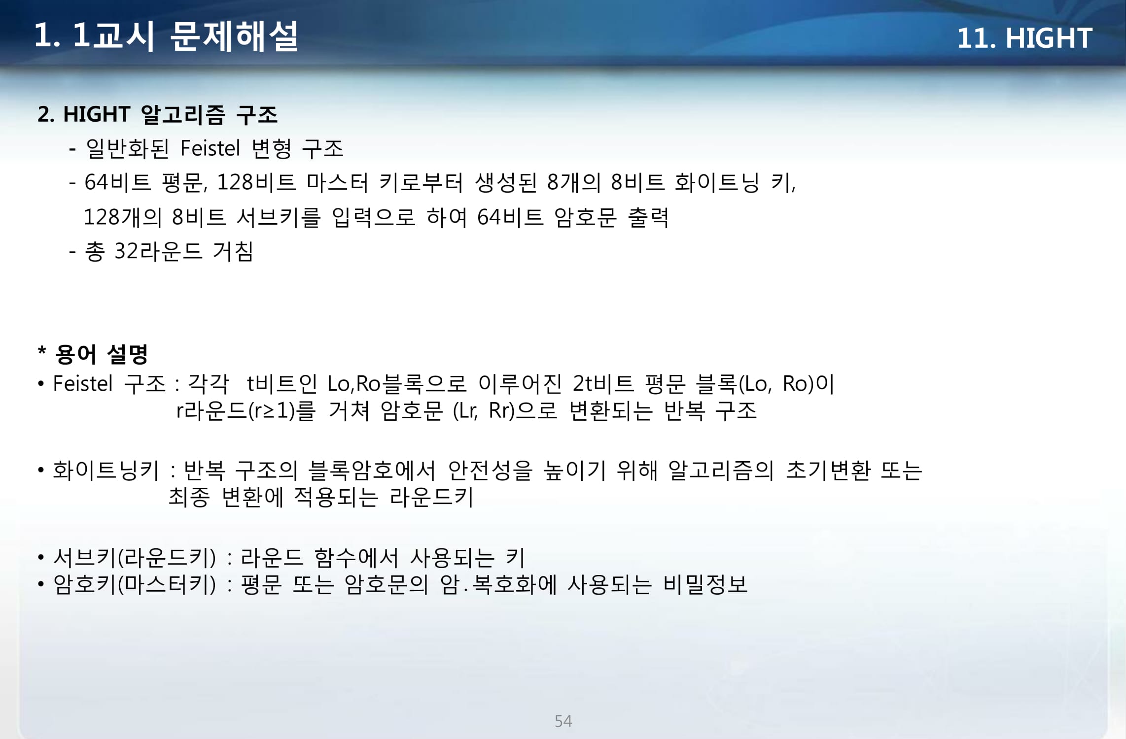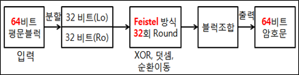 - 암호화 방식 : Feistel 방식, XOR, 덧셈, 순환이동 사용