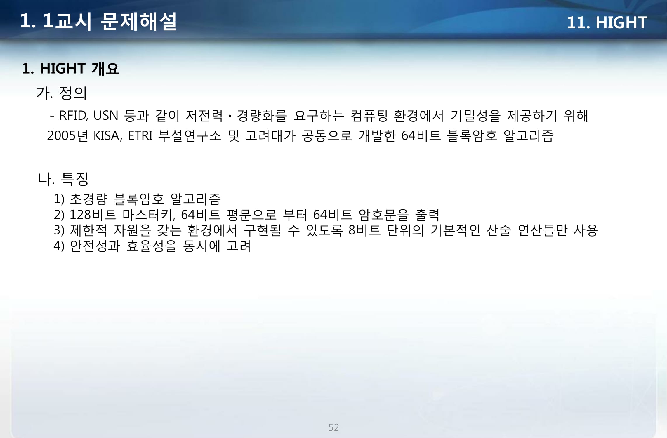 - 저전력, 경량 : 기존의 SEED를 스마트폰, 스마트카드, RFID, USN 등 모바일 기기와 무선환경에 맞도록 개선