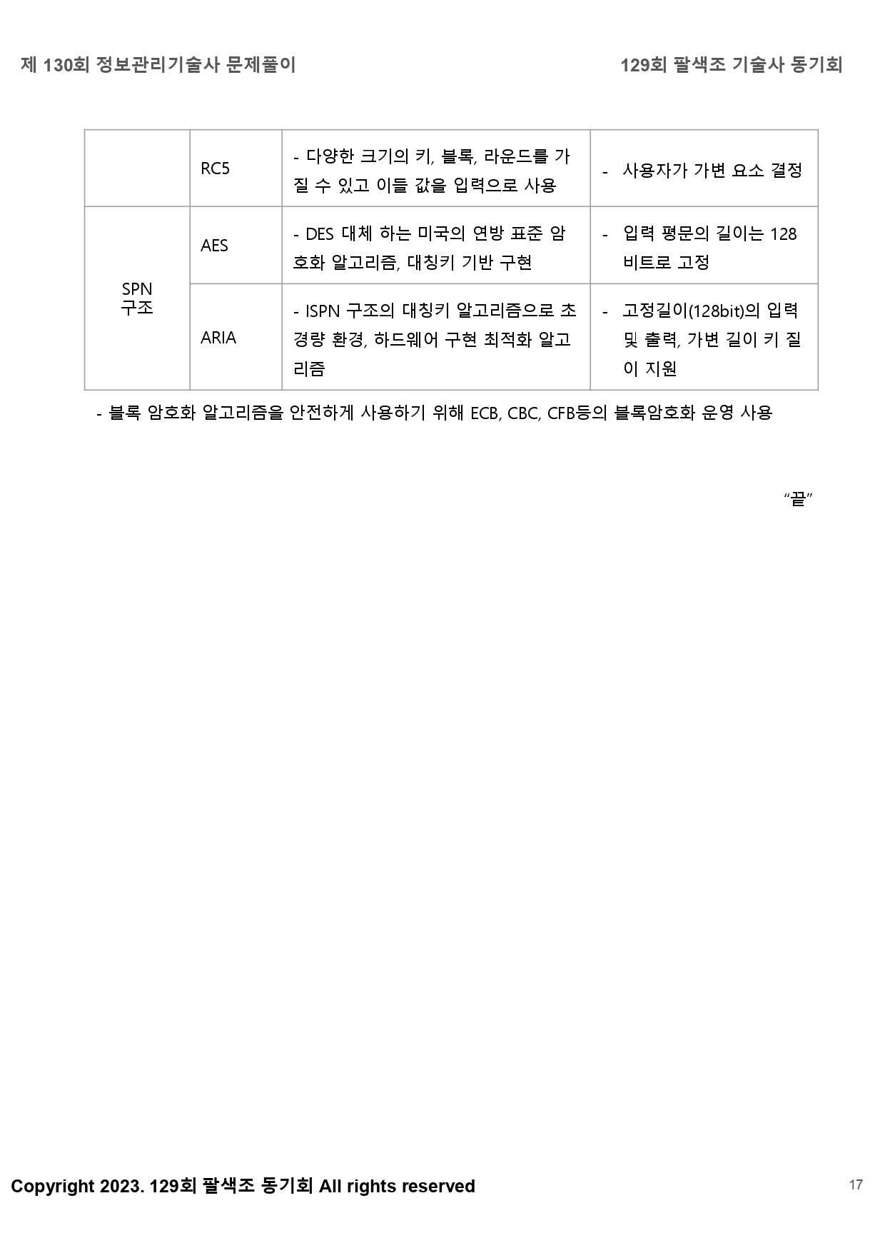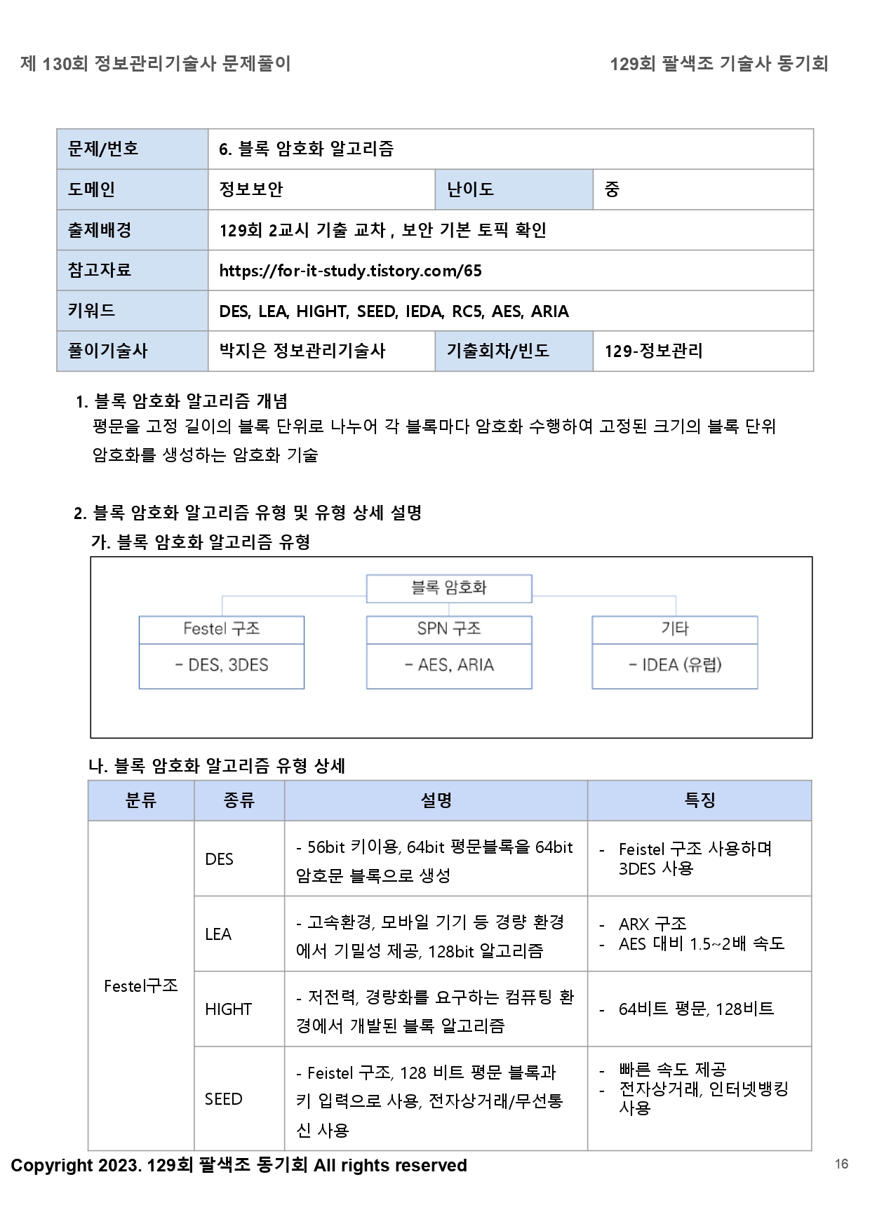 블록암호 : 평문을 일정한 블록단위로 나눔 / 기밀성확보,해쉬함수가 다양 / DES,SEED