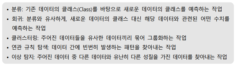 (유형) 분류(Classification), 회귀(Regression), 클러스터링(Clustering), 연관 규칙 탐색(Association rule discovery), 이상 탐지(Anomaly detection) 등이 있다