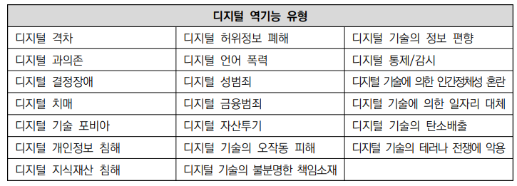 ○ (정의) 디지털 역기능(negative effect of digital technologies): 디지털 기술과 그 응용 서비스 활용에서 발생하는 부작용을 통칭하는 개념(EC, 2020; OECD, 2021; 한국지능정보사회진흥원, 2021)