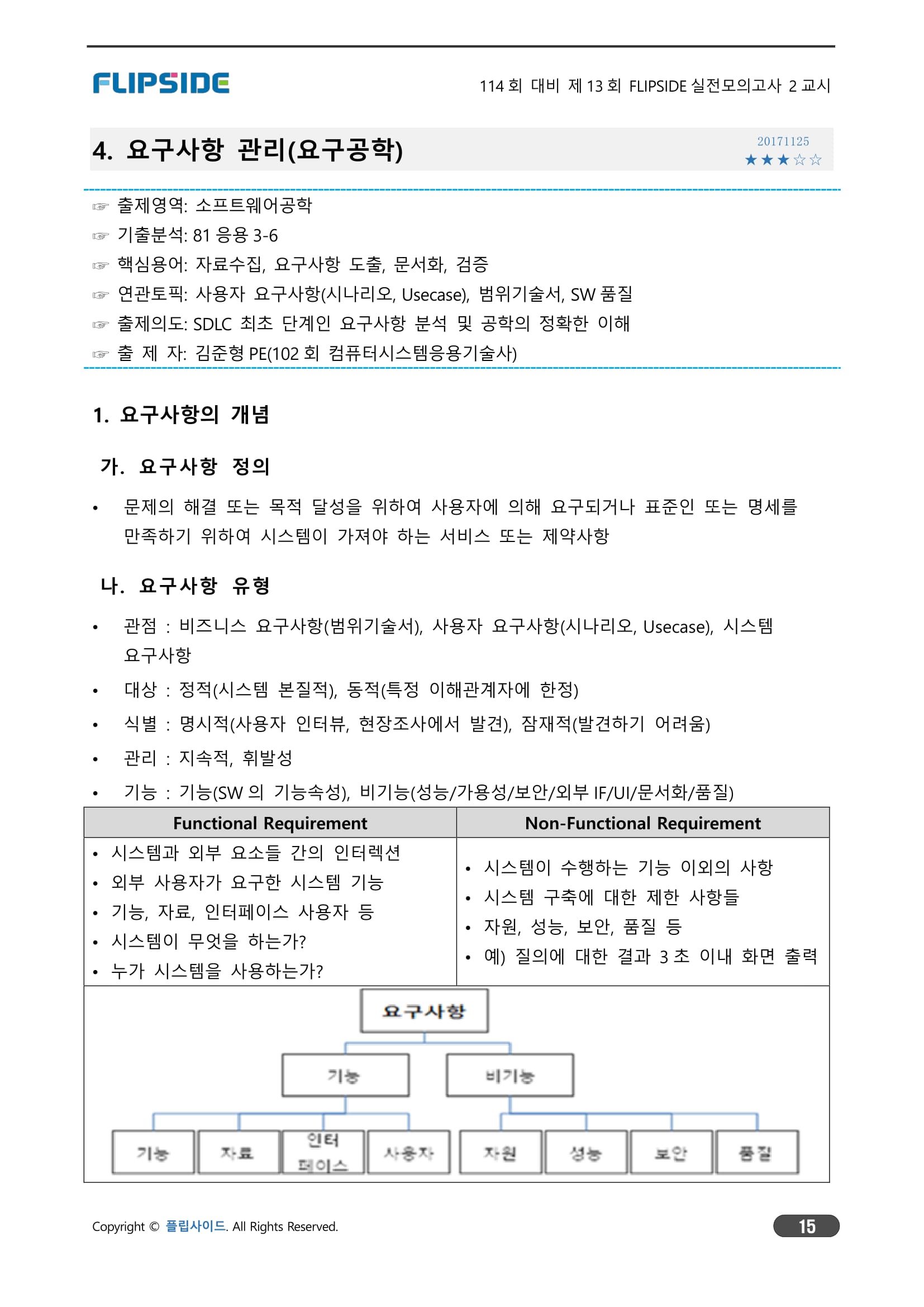 - 기능 요구사항: 기능, 자료, 인터페이스, 사용자
