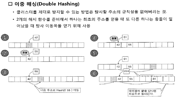 3. 이중해싱(Double Hashing) : 2개의 해시 함수를 준비해서 하나는 최초의 주소를 얻을때 사용하고 다른 하나는 충돌이 일어났을때 탐사 이동폭을 얻기 위해 사용
