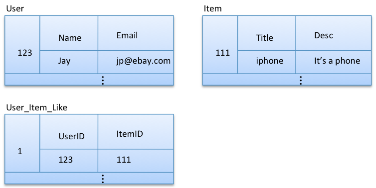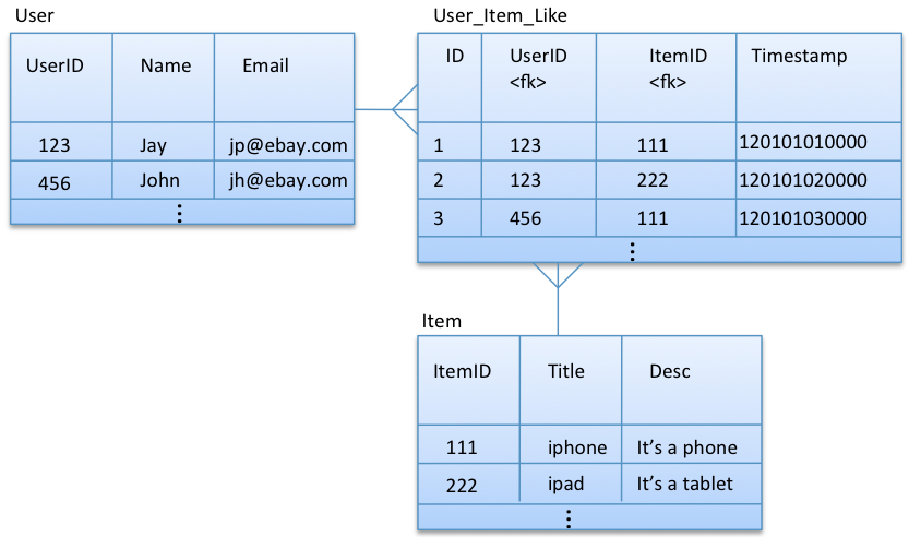 각각의 사용자는 여러 아이템을 “like” 할 수 있으며, 각각의 아이템 역시 여려 사용자에게 “like”로 선택될 수 있습니다. 이는 관계형 모델 기반으로 N:N 형태로 나타나게 됩니다.