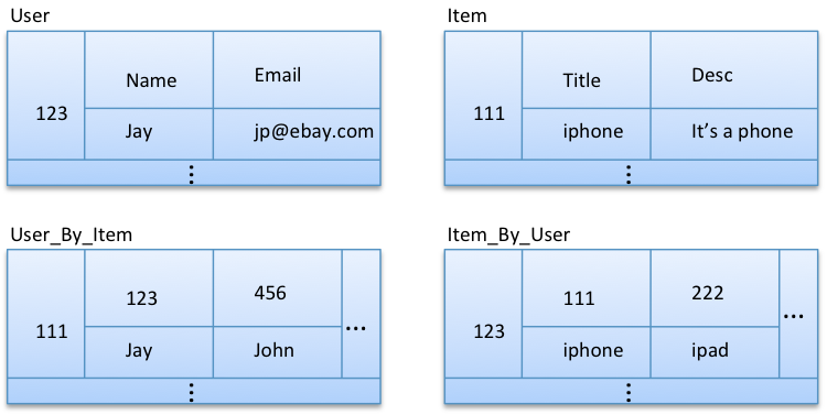 이번 예제의 모델에서는, User_By_Item과 Item_By_User 안에 사용자 이름과 제목이 비정규화 되어 있습니다. 하나의 사용자가 “like”한 모든 아이템 제목과 하나의 아이템을 “like”한 모든 사용자 이름을 효과적으로 조회할수 있도록 설계를 변경 했습니다.