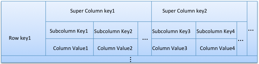 Cassandra 안에는 “Super Column” 이라는 게 존재합니다. “Super Column”을 그룹화된 컬럼이라고 간주한다면 두 개의 중첩된 맵을 3개의 중첩된 맵으로 다음과 같이 변환할 수 있습니다.