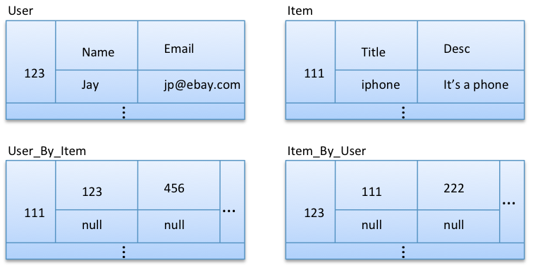 일부 유저가 Item_By_User를 사용하여 “like”한 모든 아이템을 쉽게 조회할수 있으며, User_By_Item을 사용하여 일부 아이템을 “like”한 모든 사용자를 조회할 수 있습니다.그렇지만 컬럼 패밀리가 분리돼 있기 때문에 조인이 필요한 상황이며 조인을 할 수 없기 때문에 문제가 발생할수 있습니다. 예를 들면 특정 유저에 의해 “liked”된 아이템 아이디와 제목을 원한다고 가정해 보면,