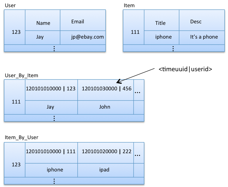 User_By_Item 와 Item_By_User 컬럼 패밀리들을 안의 timeuuid 와 userid를 합쳐서 하나의 컬럼키로 구성합니다.